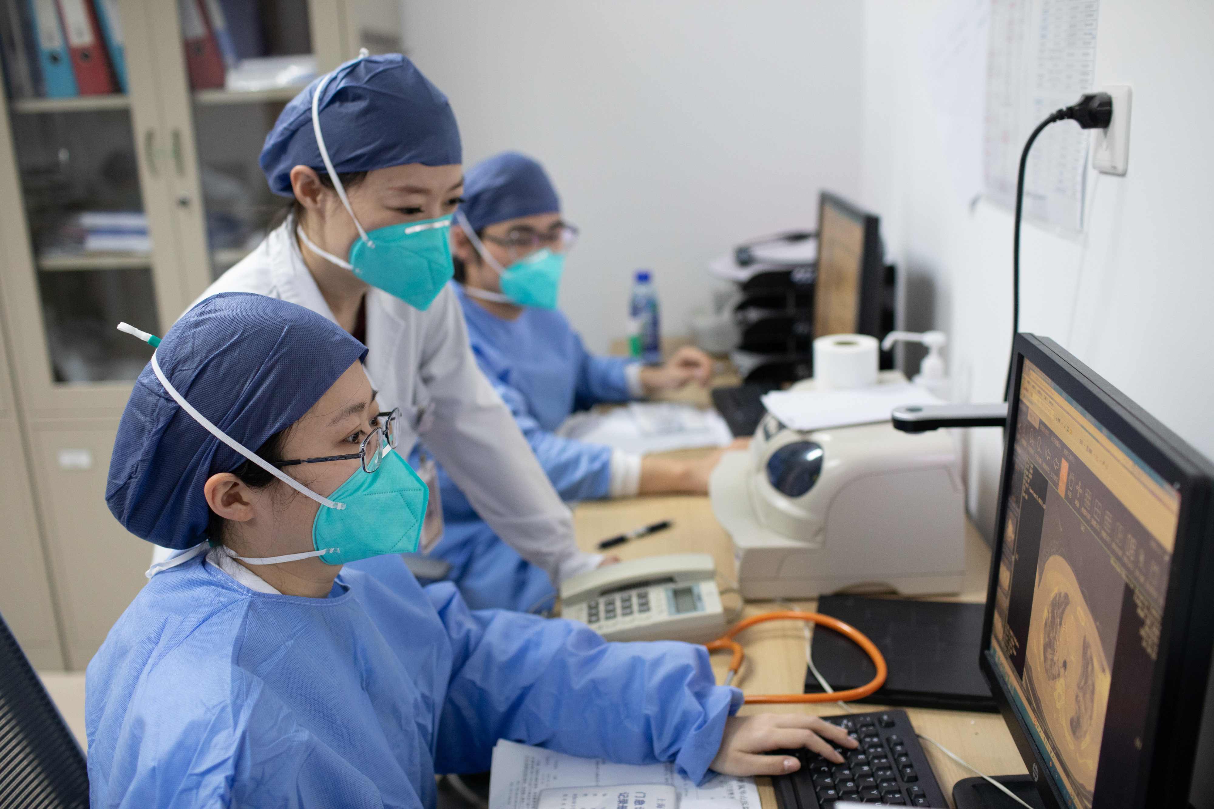 1月12日,在复旦大学附属华山医院虹桥院区急诊抢救室医生办公室,医生查看患者的胸部CT。新华社记者 金立旺 摄