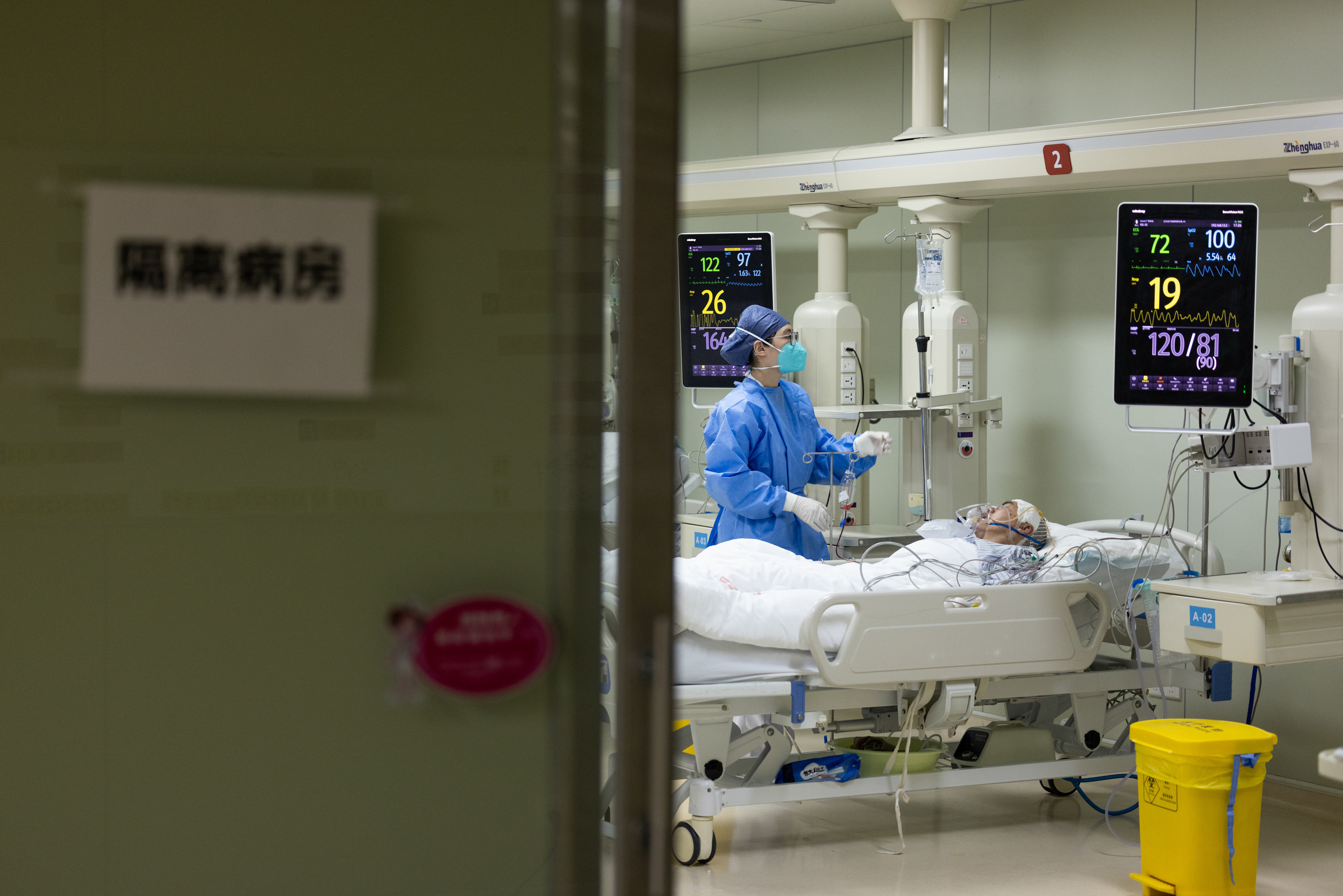 1月12日,在复旦大学附属华山医院虹桥院区收治肺炎患者的重症监护室,护士查看患者输液情况。新华社记者 金立旺 摄