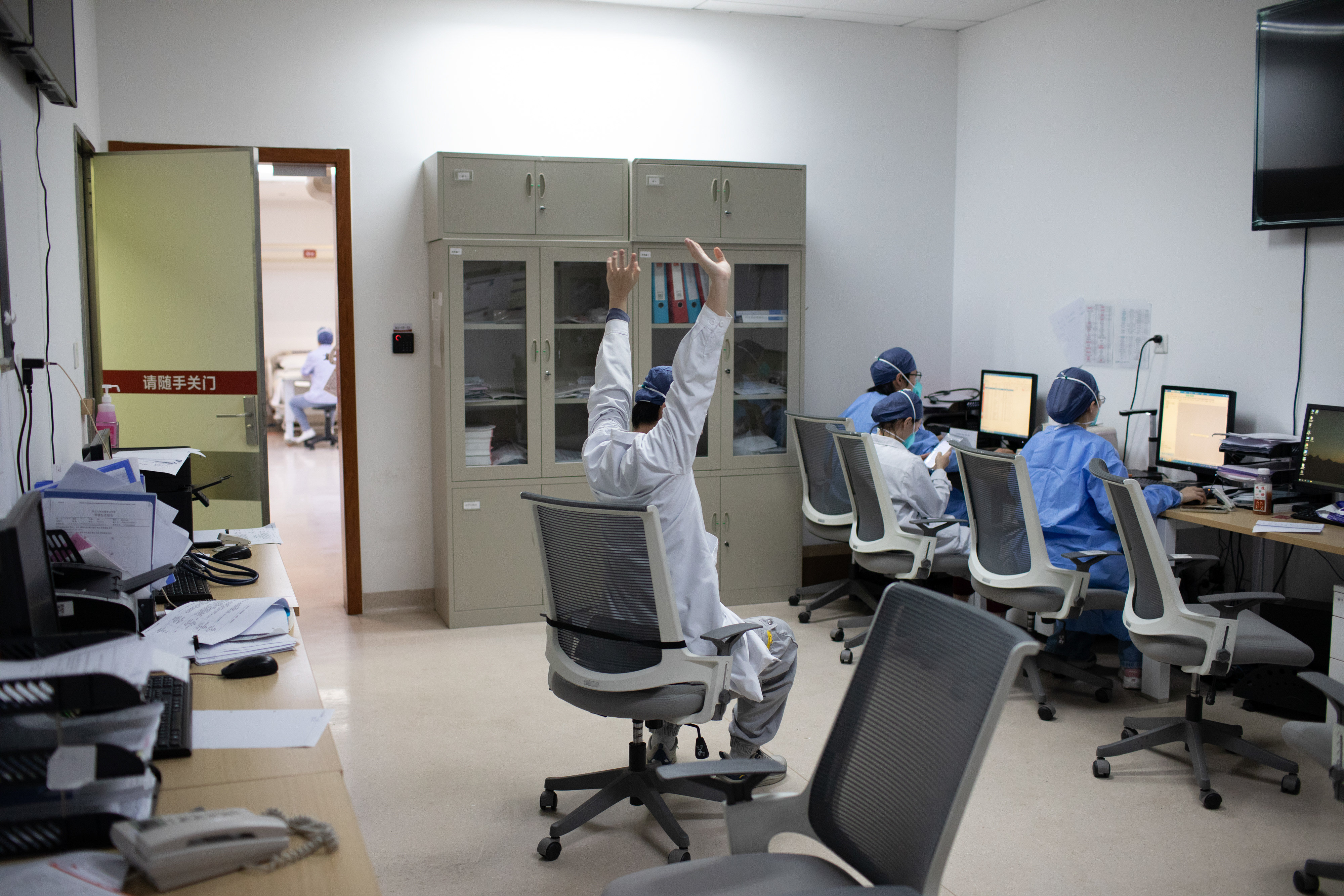 1月12日,在复旦大学附属华山医院虹桥院区急诊抢救室医生办公室,一名医生(左)在放松身体。新华社记者 金立旺 摄