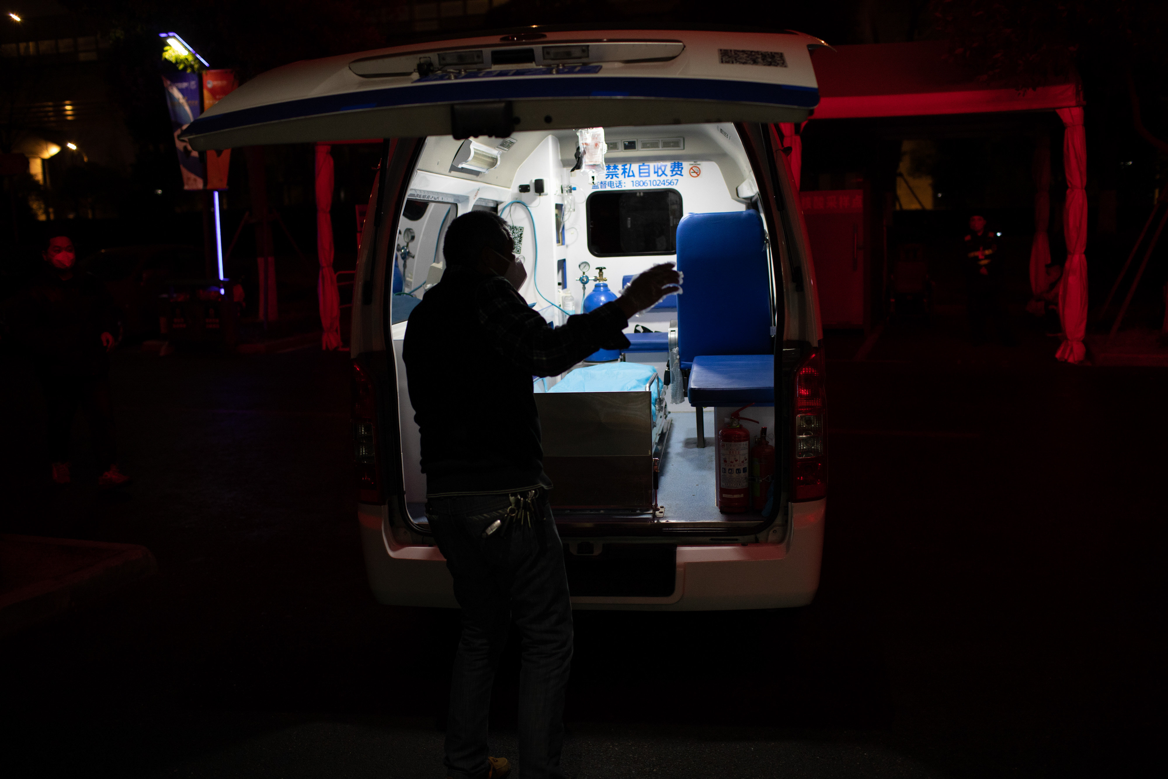 1月12日,在复旦大学附属华山医院虹桥院区急诊大厅外,一辆转运车工作人员做完消杀处置后准备离开。新华社记者 金立旺 摄