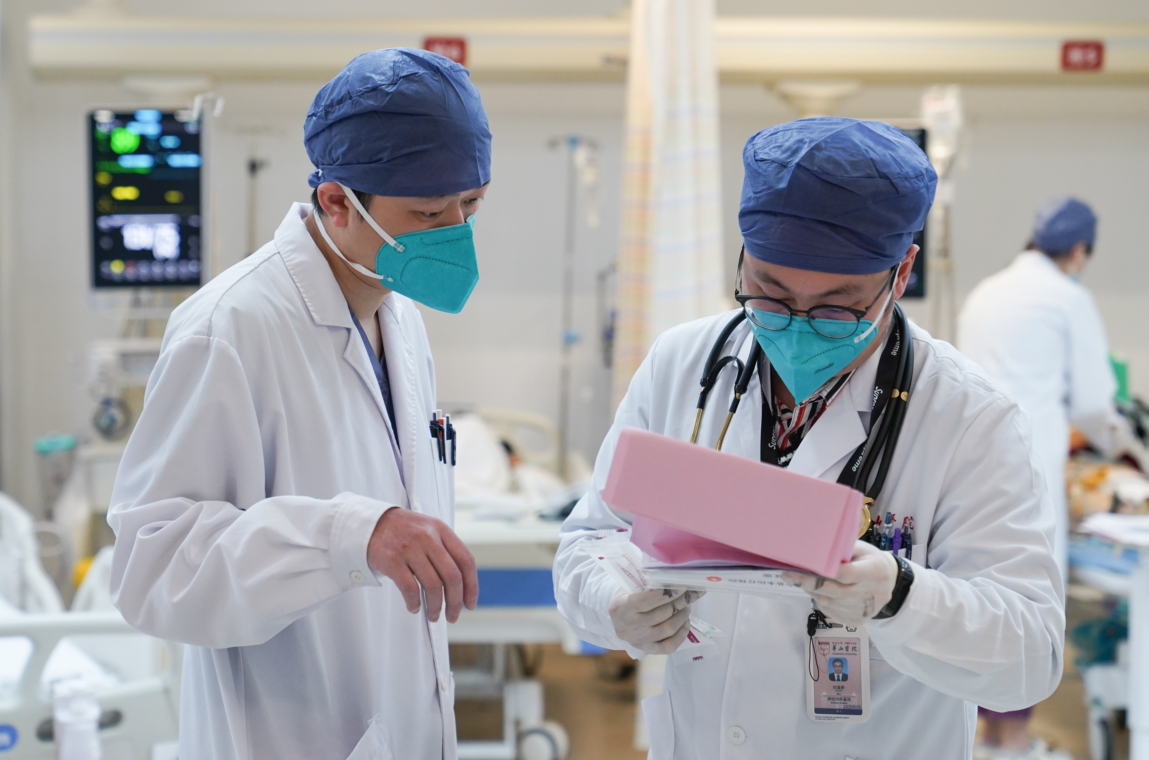 1月7日,在复旦大学附属华山医院虹桥院区急诊抢救室,医生刘逸奇(右)和同事讨论患者病情。新华社记者 杨有宗 摄