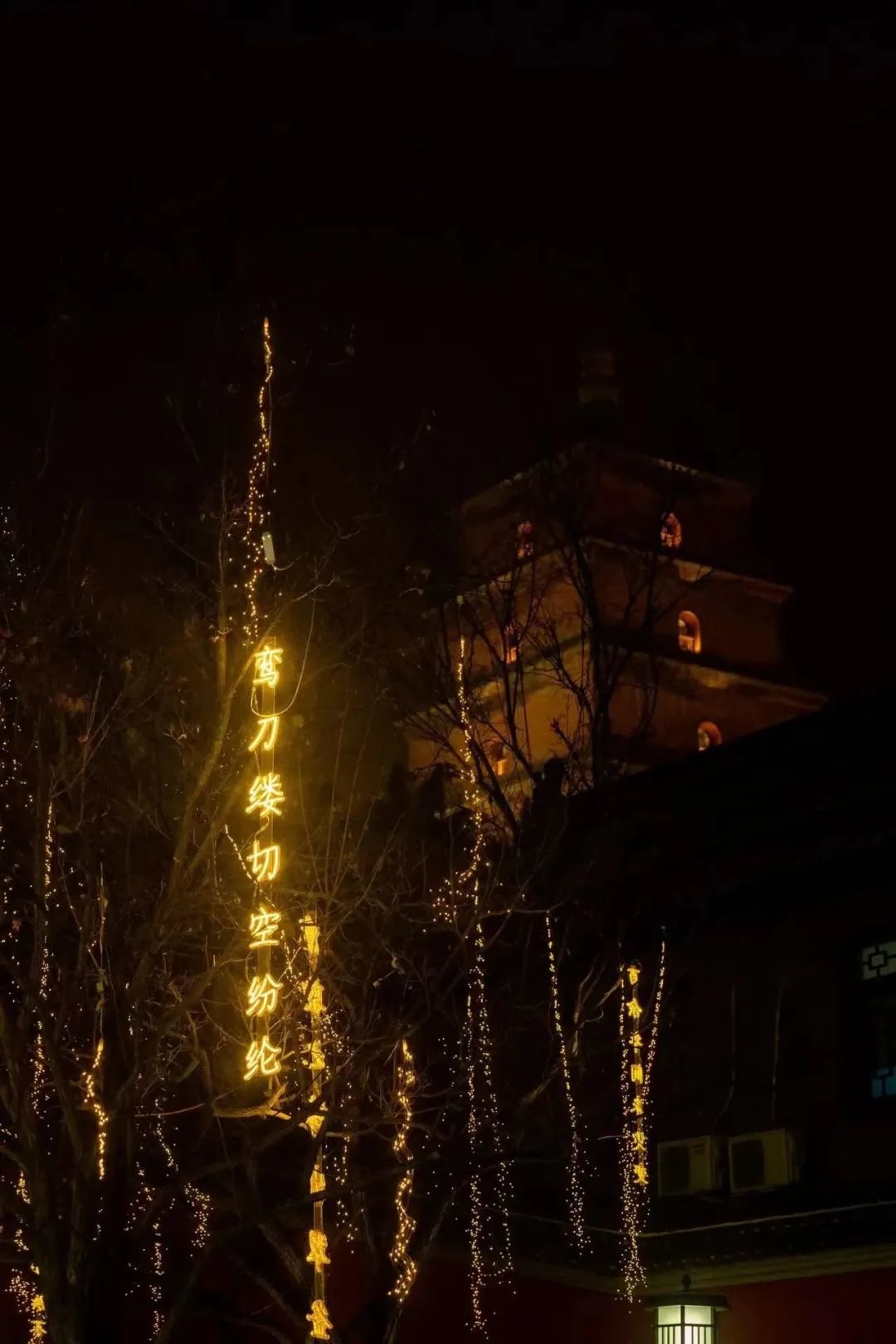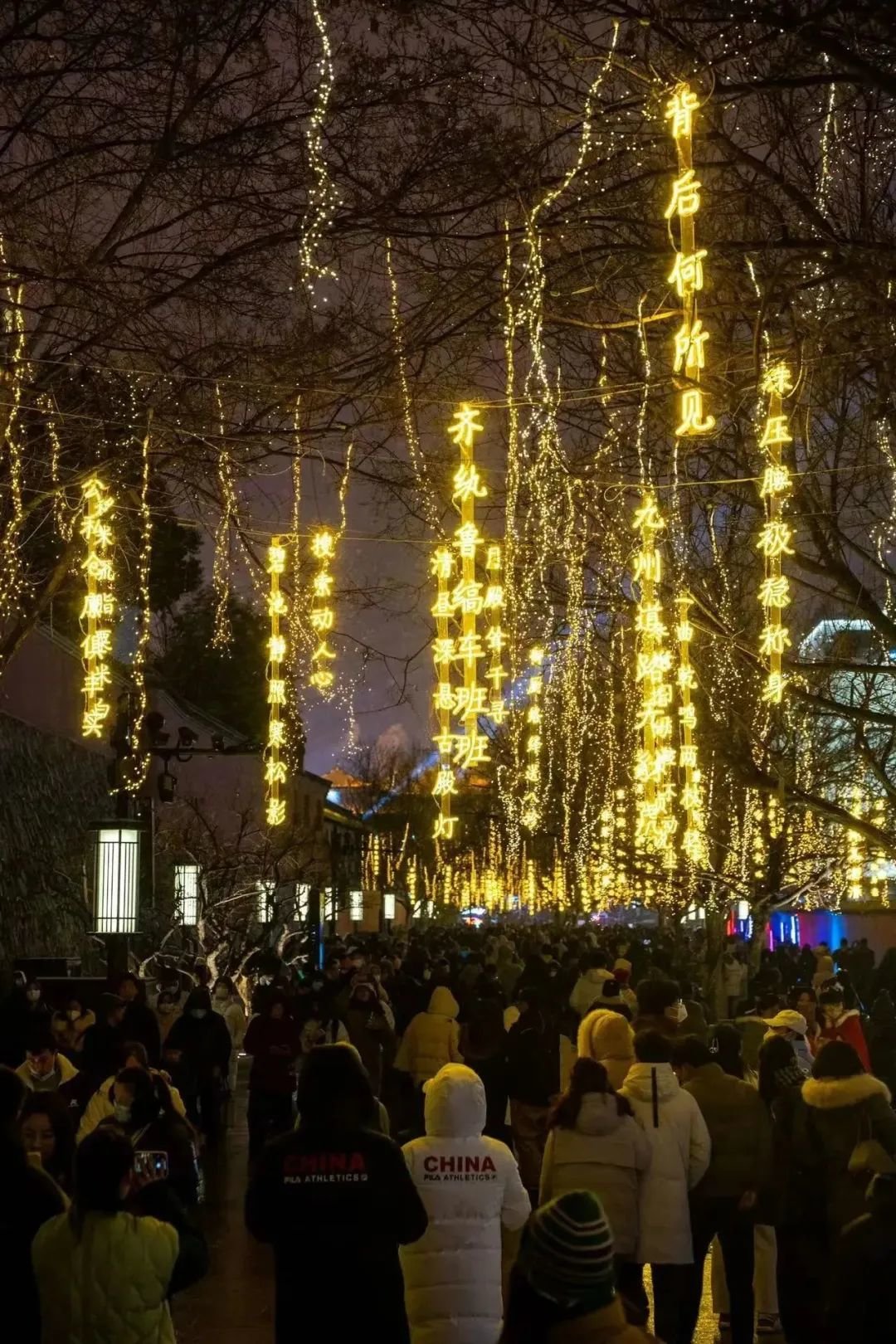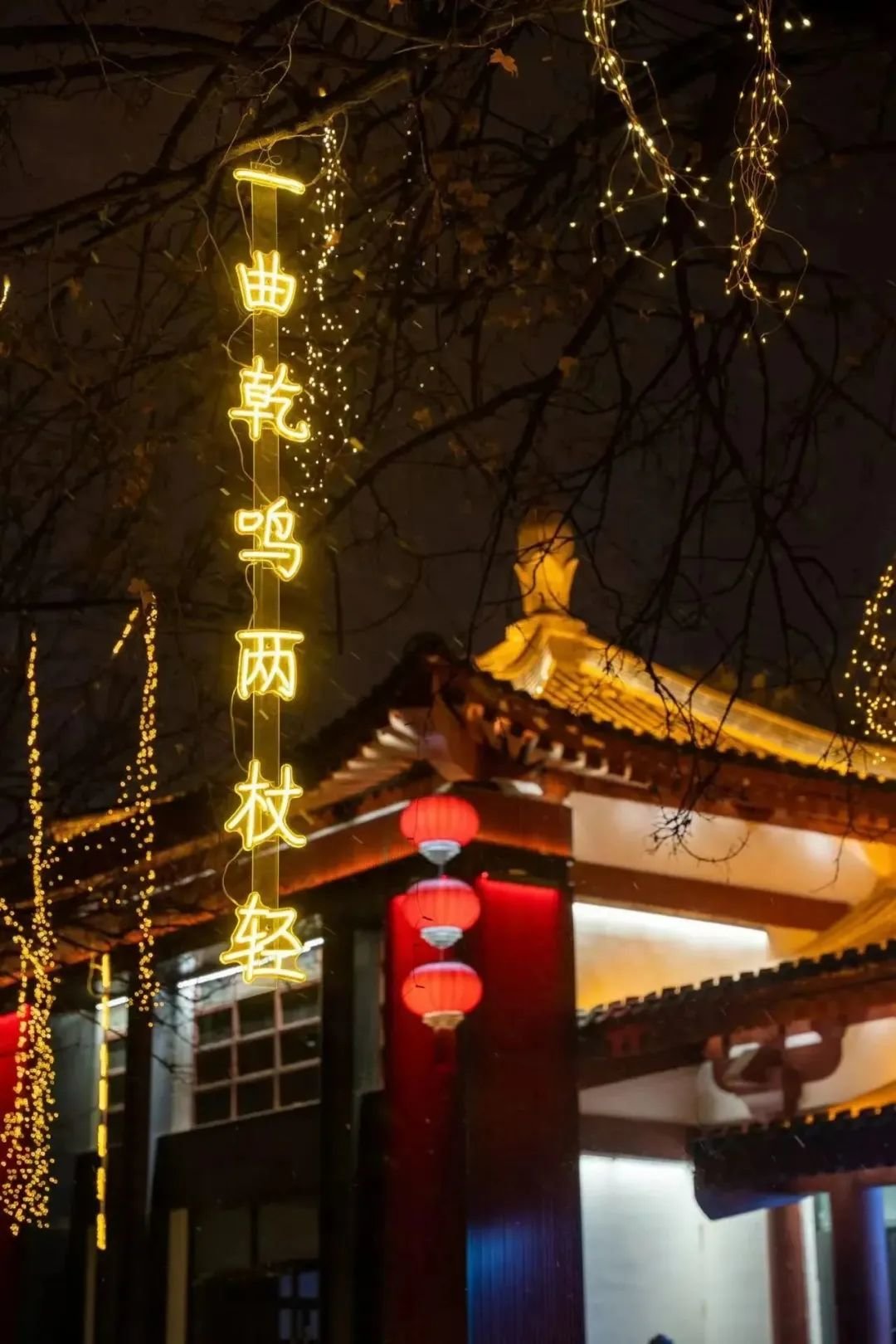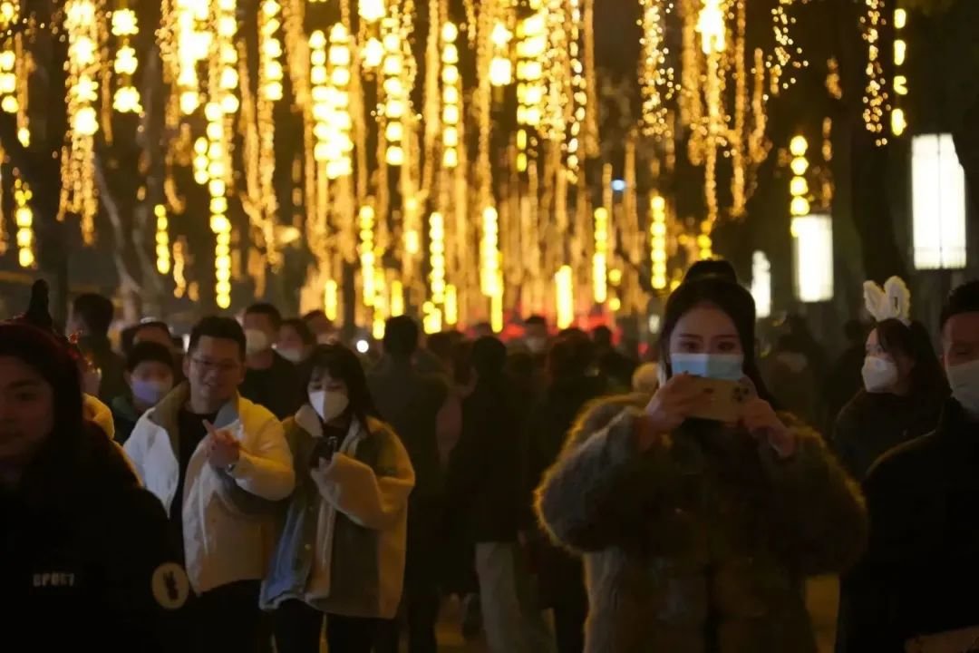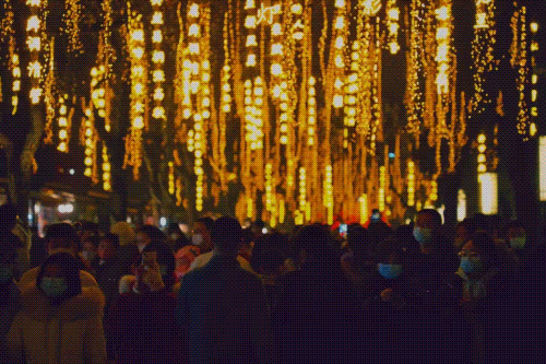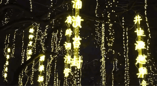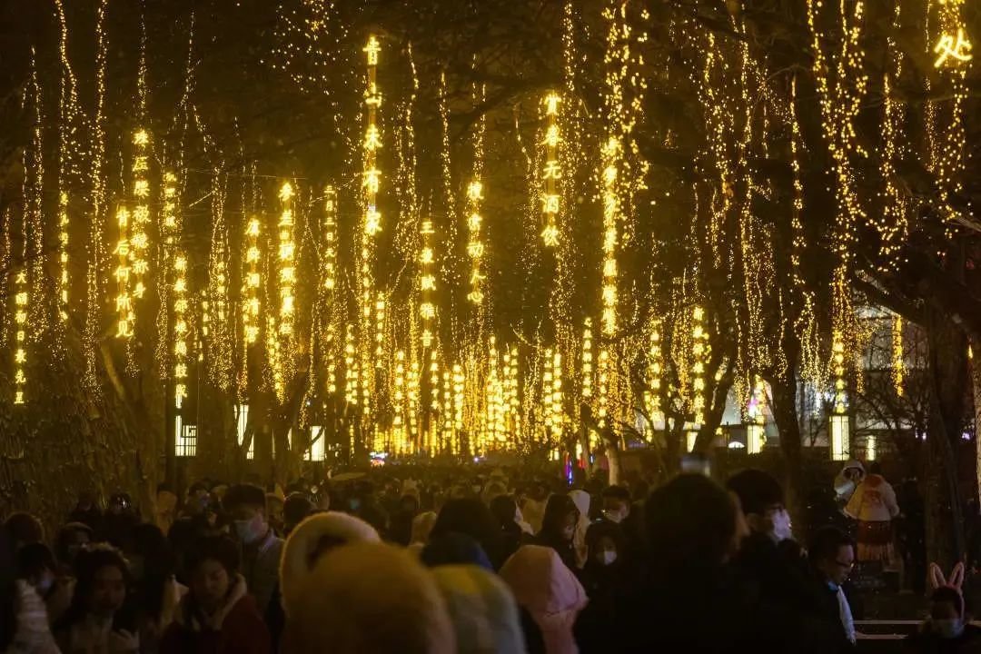 从大雁塔东西两侧向里走,林荫路影影绰绰,烂漫的灯火缀在树梢,火树银花连绵如织,道路宛若两条熔金的河。走近一看,垂下来的点点光晕来自一句句古诗词形成的灯,一步一景,句句都是大唐风貌、人间烟火,正是“诗意长安路”。