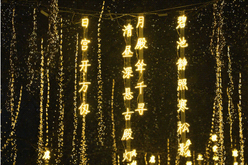 在“古诗词路”上,数十首唐代古诗及其中节选组成的彩灯迎面而来,从《终南山》《玉声如乐》到《丽人行》,再从《阳春歌》《守岁》到《贞观之治》,由美景、雅乐、丽人写到佳时、盛世,好一派盛唐璀璨景象。