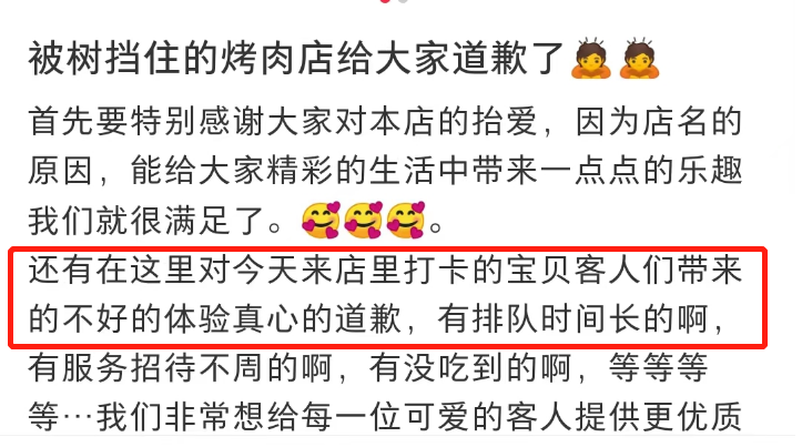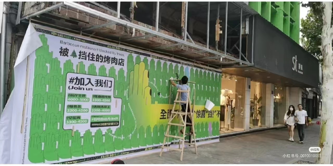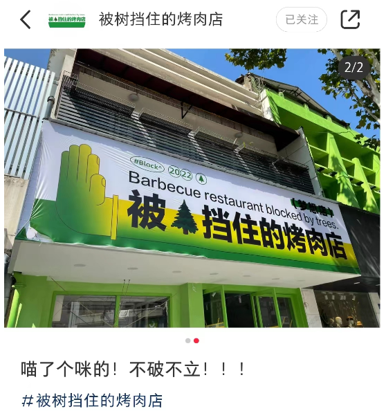 所以这家烤肉店虽然被树挡住了,但是挡不住老板的人文关怀。当然店招火了之后,老板也要持续整活儿,才能变成长红。
