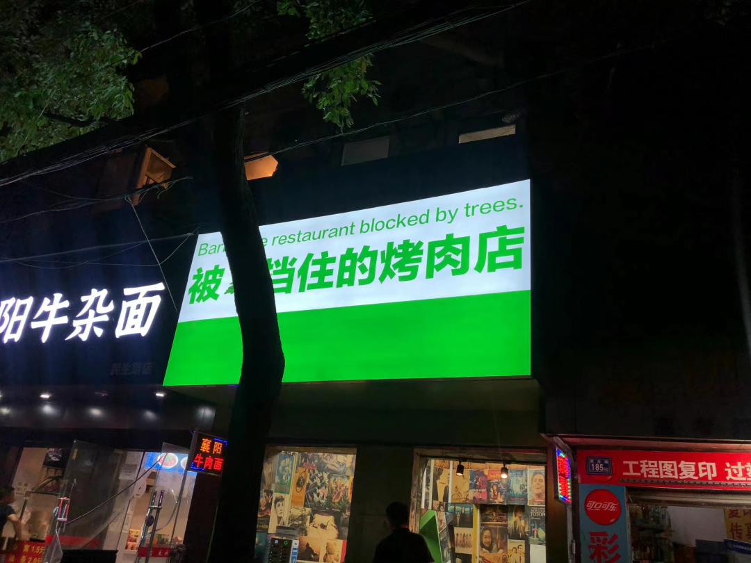 不求“天时地利人和”,至少要把“地利”拿捏住。但这家烤肉店偏偏就被一棵树挡住了,很多慕名而来的顾客,经常很难找到地方。