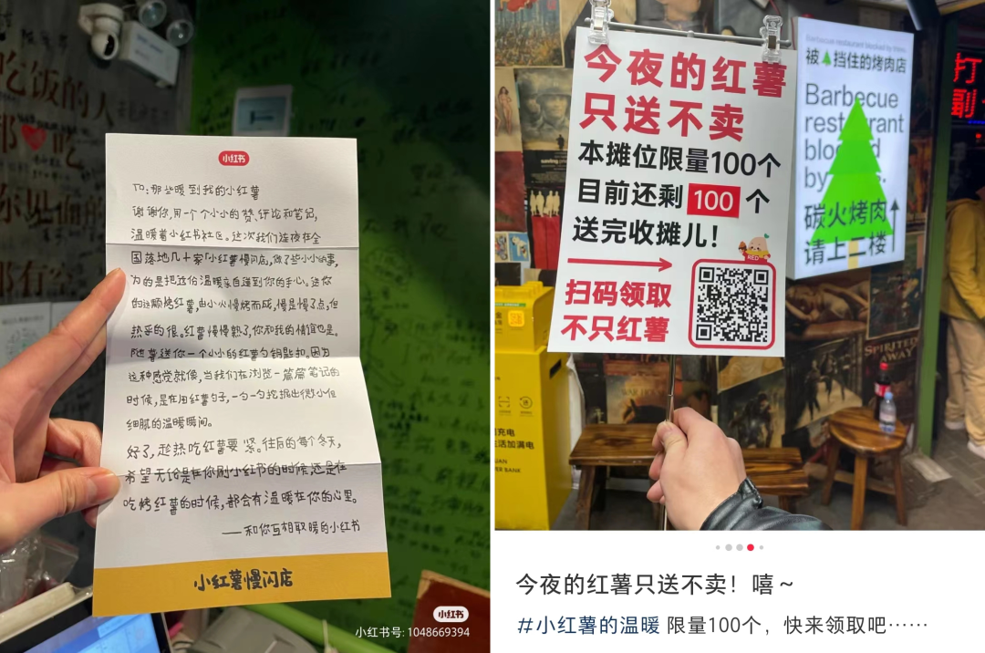 去年1月,“被树挡住的烤肉店”联合小红书整活儿,推出“小红薯慢闪店”只送不卖的红番薯的互动。这可谓人间烟火气,最抚凡人心。