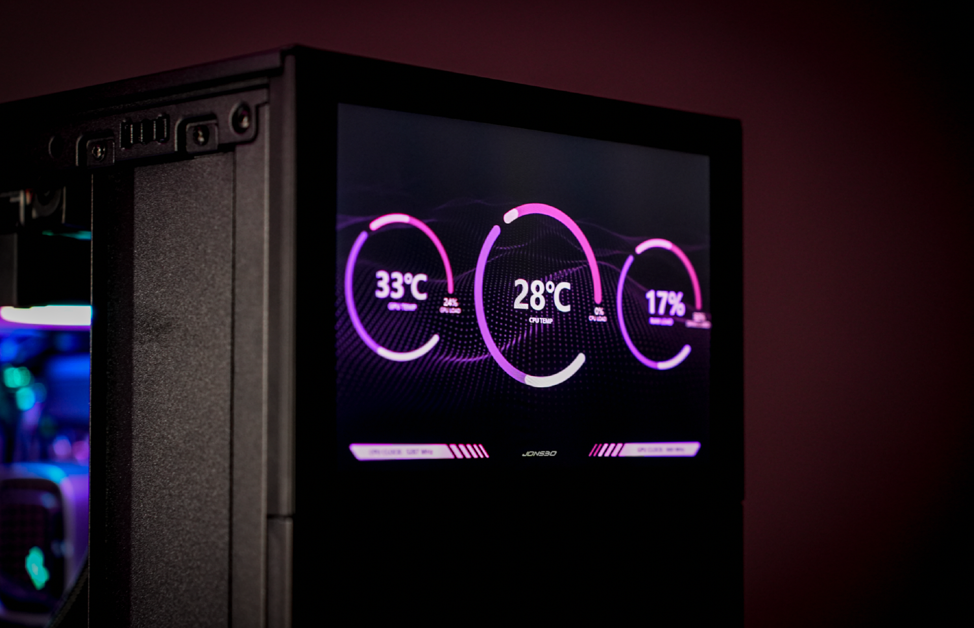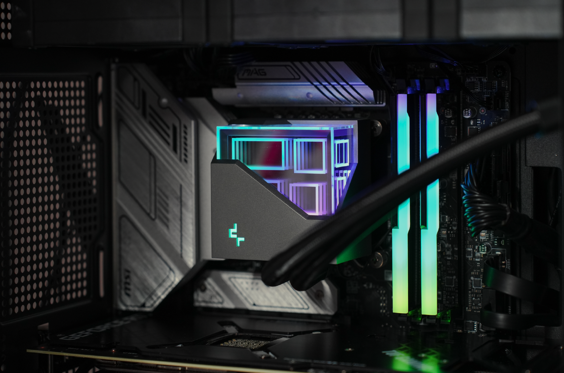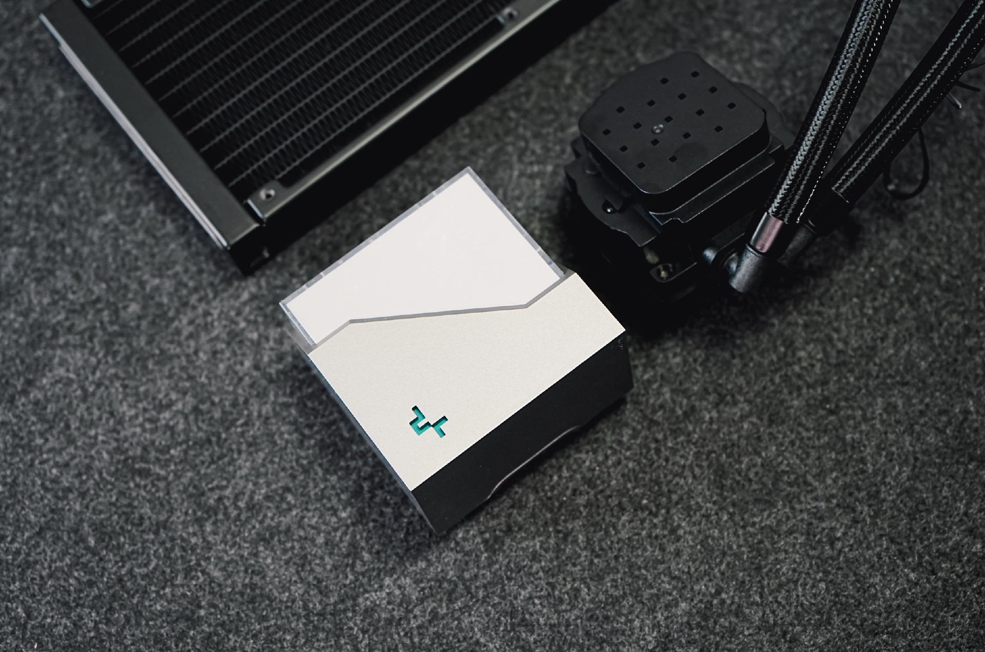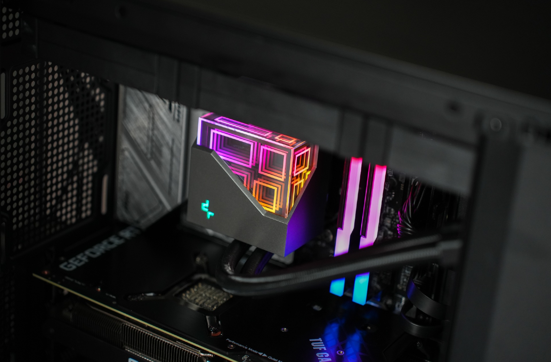 散热器选用的是九州风神冰魔方360,该散热器也是九州风神在去年打造的高颜值+高性能水冷。特点是水冷头的设计非常酷炫,采用了华丽的多维无限镜像设计,点亮后瞬间让人眼前一亮。