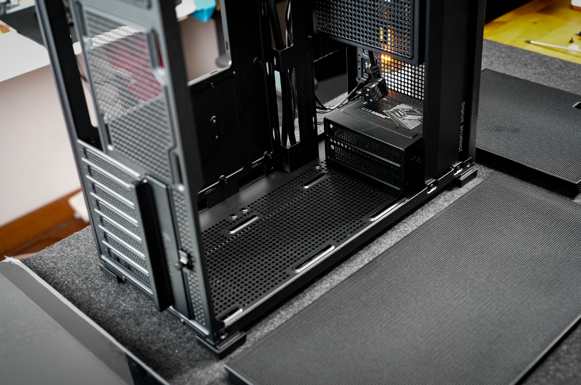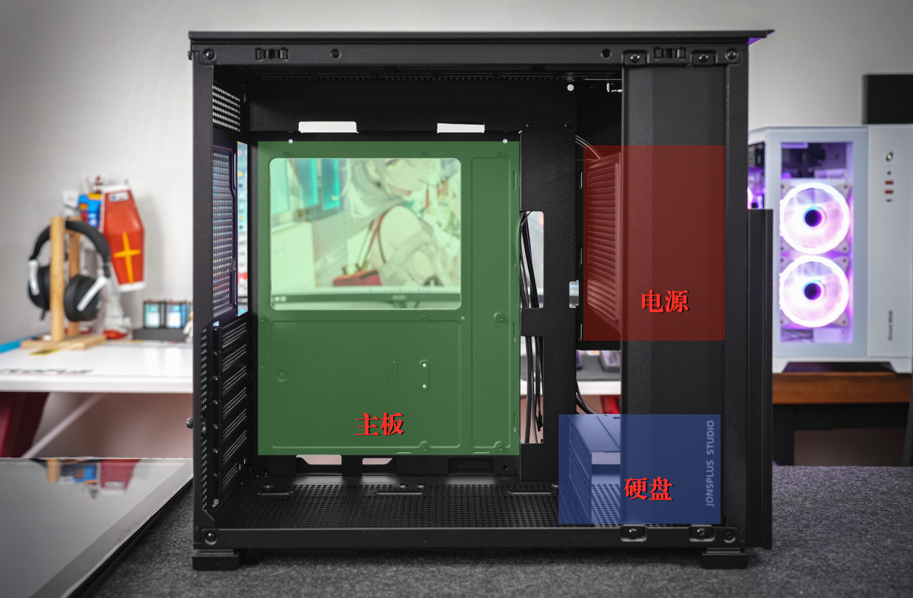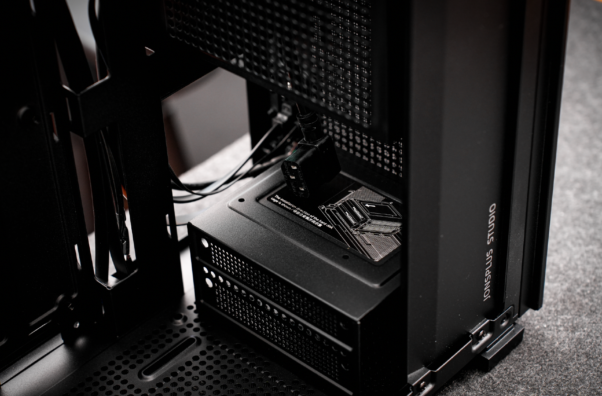 并且为了更好的视觉效果,乔思伯的设计师还在机箱内部设计了一个挡板,刚好挡住电源和硬盘。