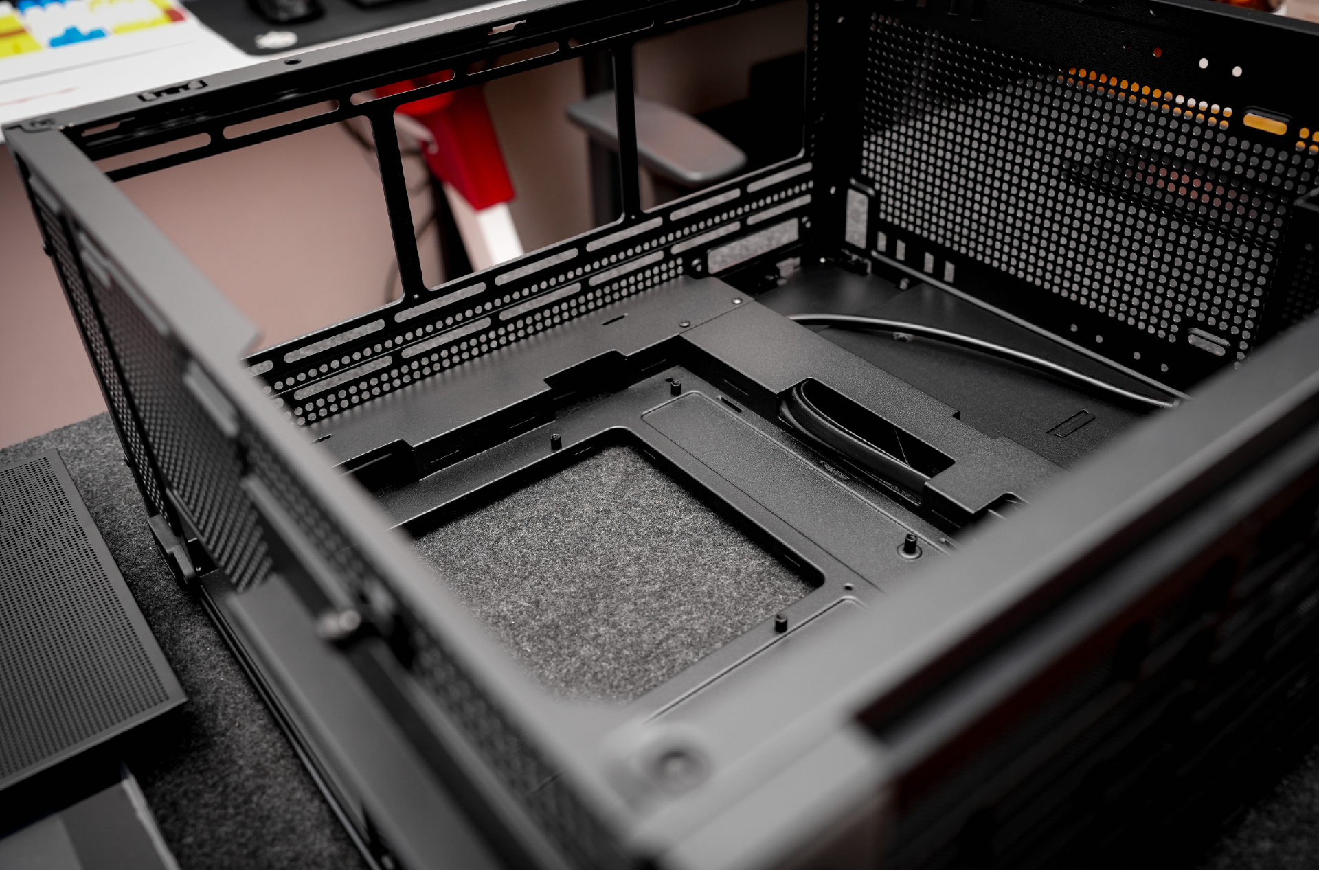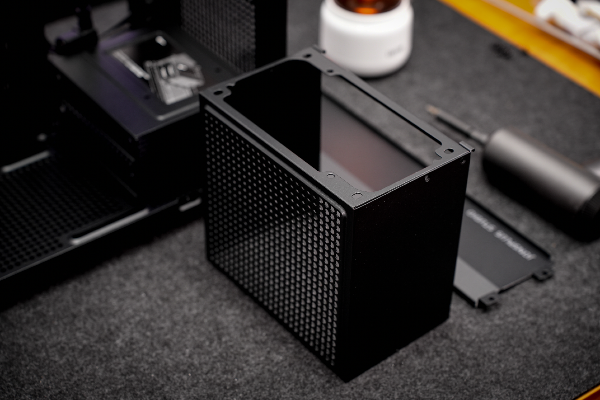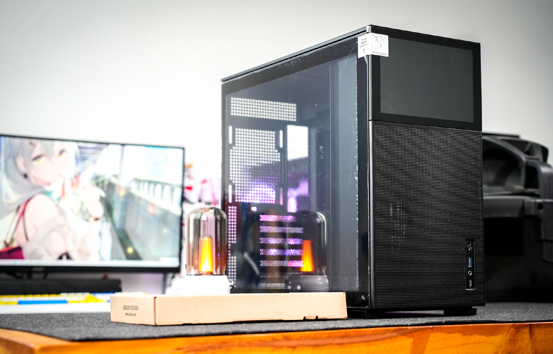 并且为了更好的视觉效果,乔思伯的设计师还在机箱内部设计了一个挡板,刚好挡住电源和硬盘。