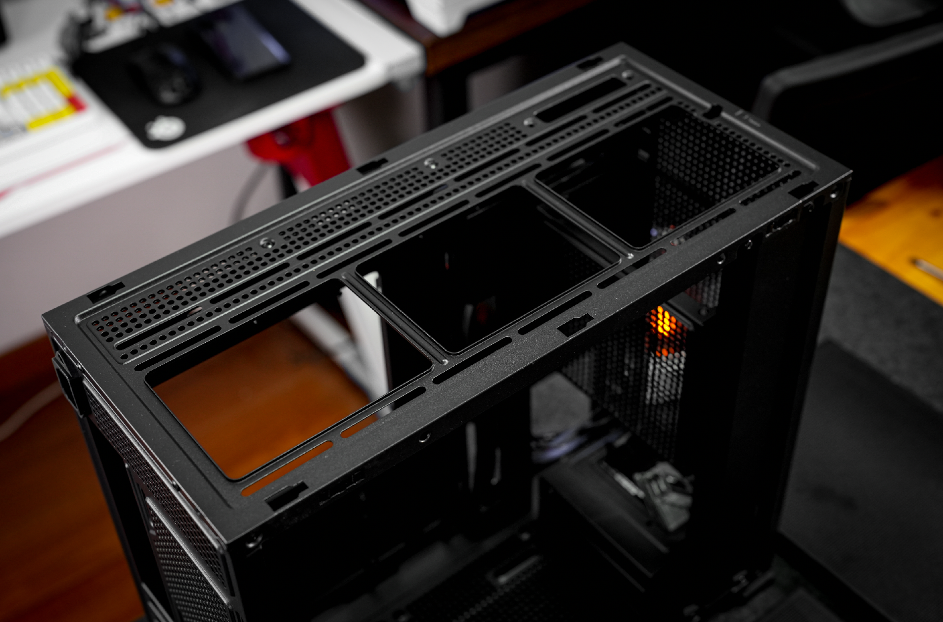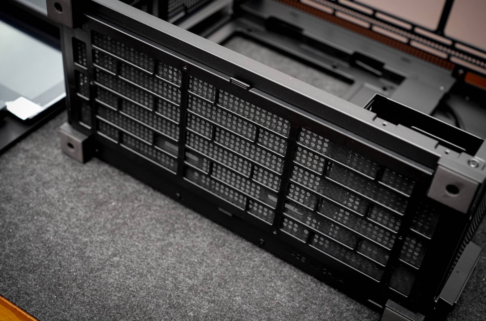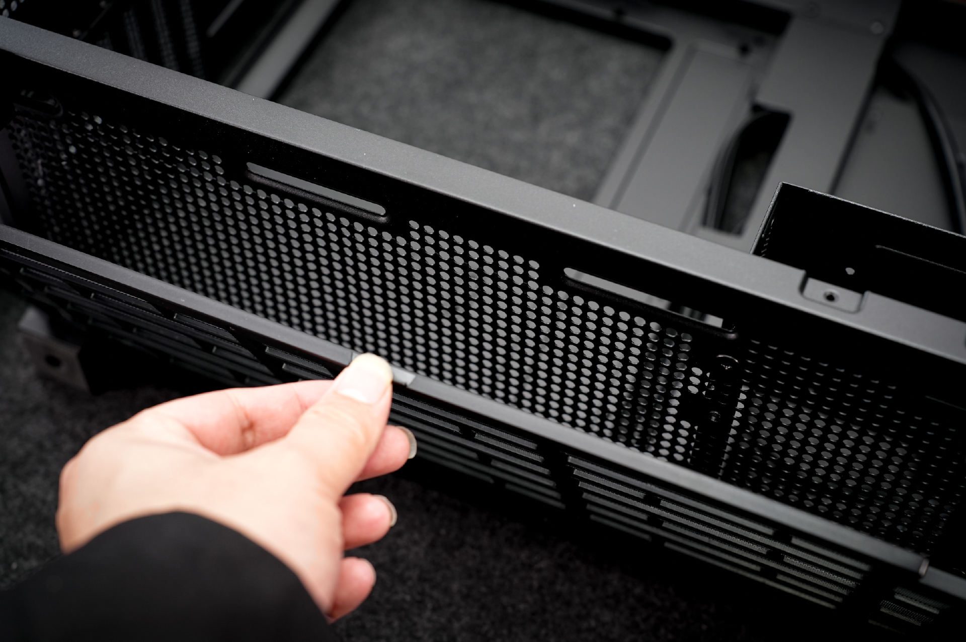 值得一提的还有该机箱的大部分配件都是采用了免工具拆解的卡扣设计,包括副屏以及左侧的钢化玻璃挡板。