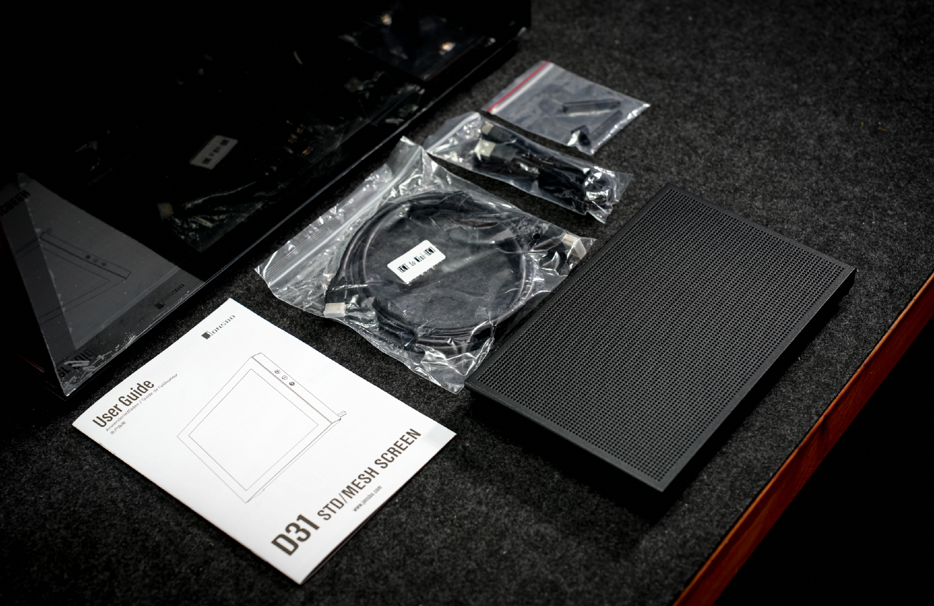 附件方面,D41包含了副屏所使用的HDMI线材、Type-C供电线、屏幕支架外,还有附赠一块网孔设计的金属挡板。主要目的就是为了方便用户将副屏拆出放在桌面上使用。