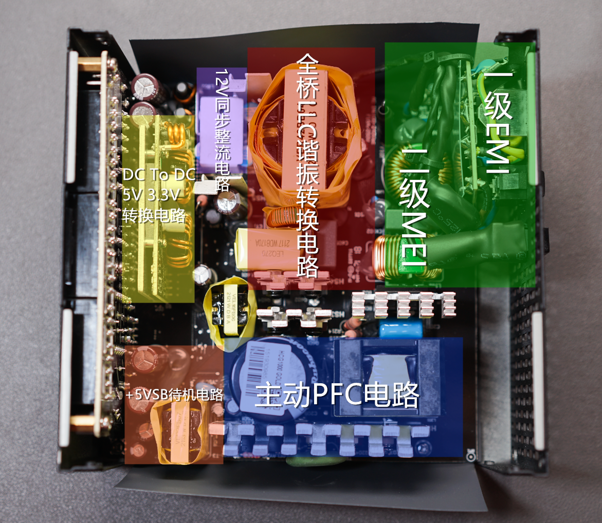 我此前也对其进行了拆解,其采用了主动式PFC+全桥LLC谐振+同步整流+DC to DC架构,全日系电容设计。+12V输出电流最高可达83A,相当于996W功率,+3.3V与+5V则通过DC to DC电路从+12V调压输出,最高输出电流均为25A,两路联合输出的额定功率最高为125W,整体额定功率则为1000W。