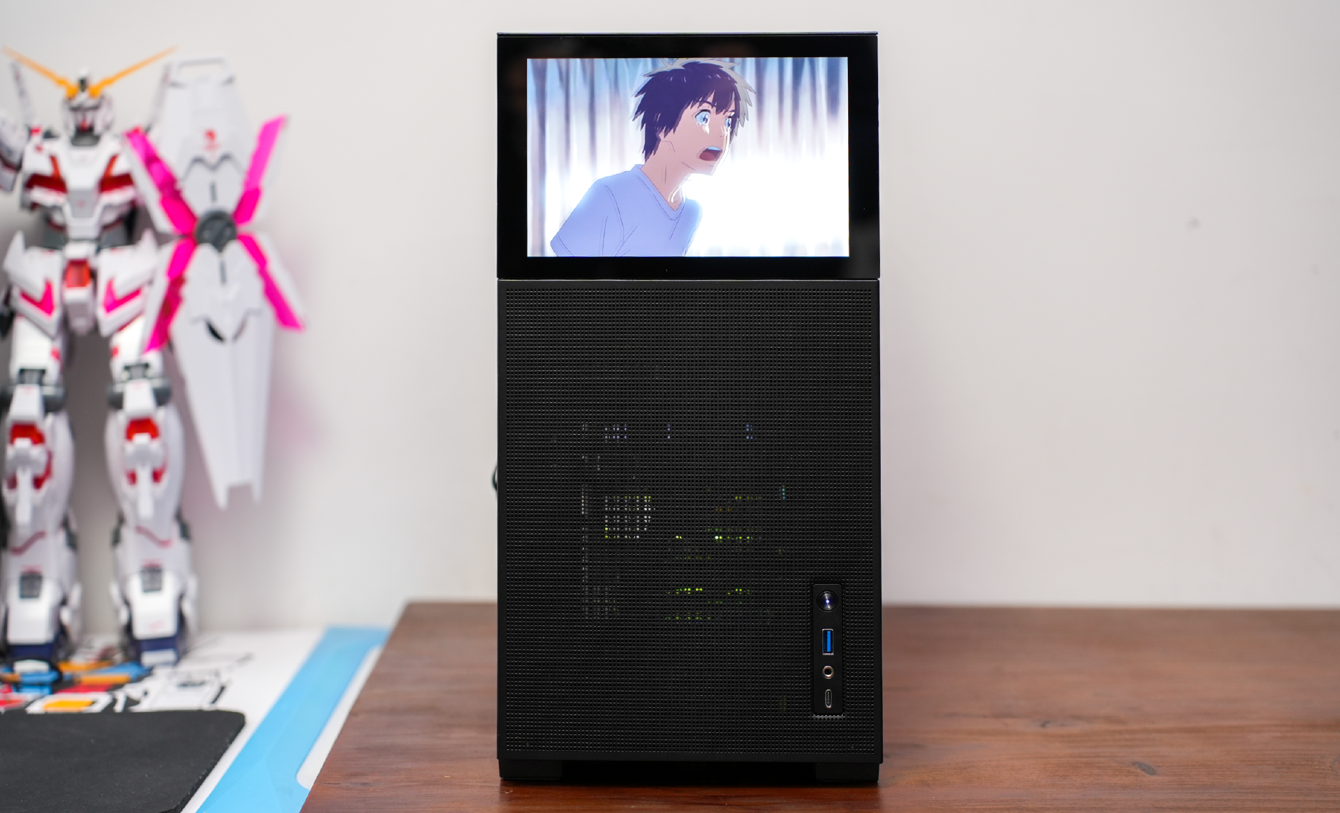 在外观设计方面,D41显得非常简约,前面板下方是网孔设计的金属挡板,上方是屏幕,侧挡板则是钢化玻璃。总体尺寸为205mm(宽)*407mm(高)*452mm