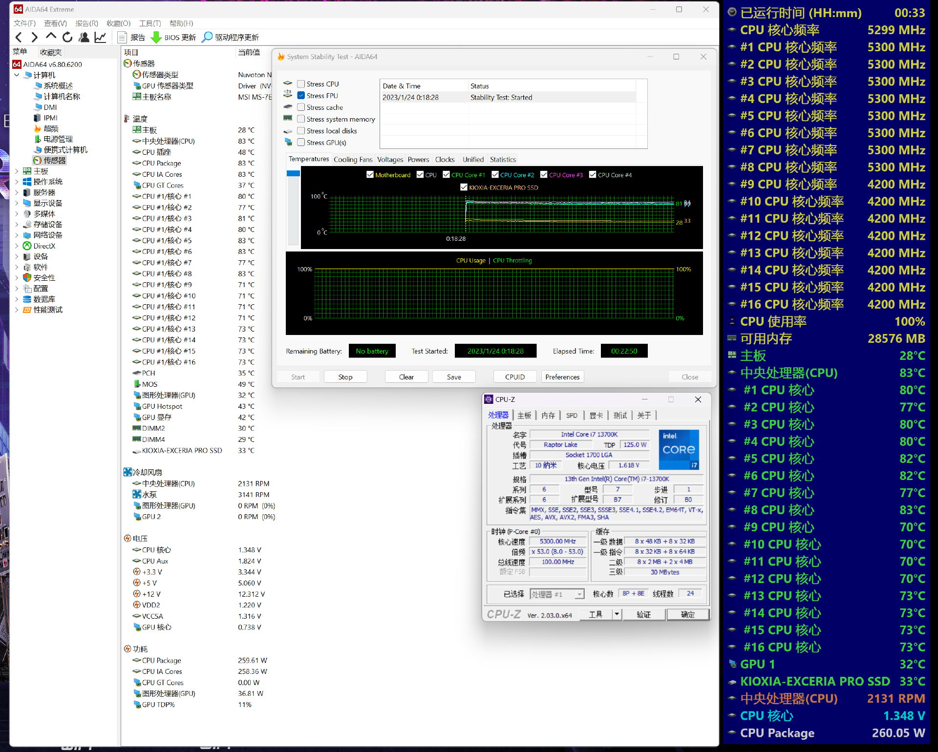 通过AIDA64拷机实测,i7-13700K的P核为5.3GHz,E核为4.2GHz,CPU核心电压为1.344~1.35V。虽然CPU总功耗满载高达260W,但九州风神冰魔方360水冷散热器散热性能强悍,在室温17℃的情况下,将CPU温度压到83℃,轻松满足日常使用需求。