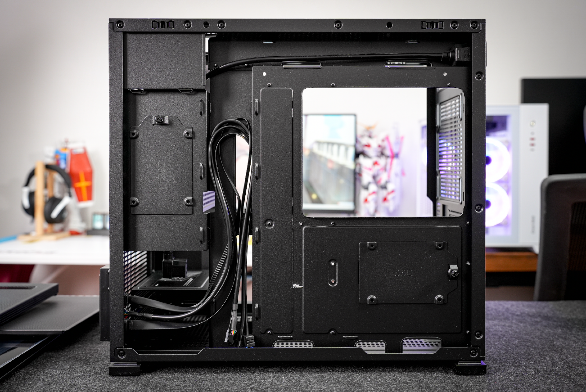 背面的设计也有点意思,除了顶部的硬盘位,设计上还在主板和电源的后方分别设计了一个2.5英寸的SSD盘位。