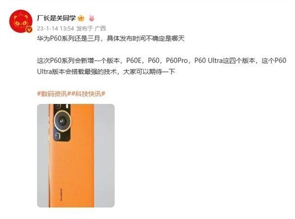 本周末有博主曝光称,华为P60系列将会在三月份发布,这次P60系列会新增Ultra版本,共有P60E,P60,P60Pro,P60 Ultra四个版本,其中P60 Ultra会搭载最强的技术,无疑非常值得期待。