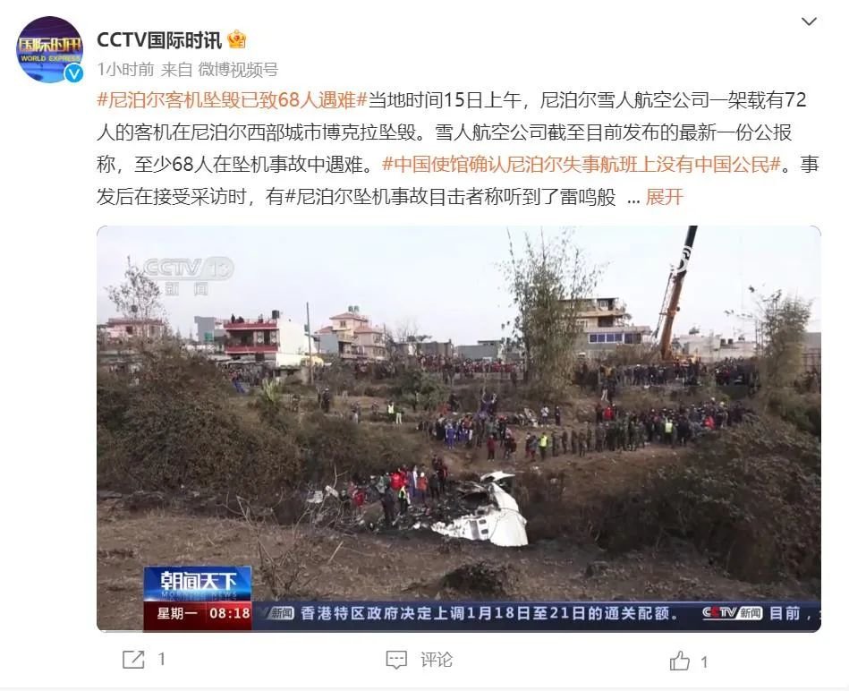 据尼泊尔媒体报道,当地时间1月15日上午,尼泊尔雪人航空公司一架从首都加德满都飞往尼泊尔西部旅游城市博克拉的ATR-72型客机在博克拉旧机场和新机场之间的位置坠毁。坠毁客机上共搭载72人,包括68名乘客和4名机组人员。