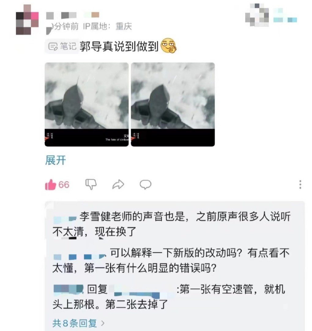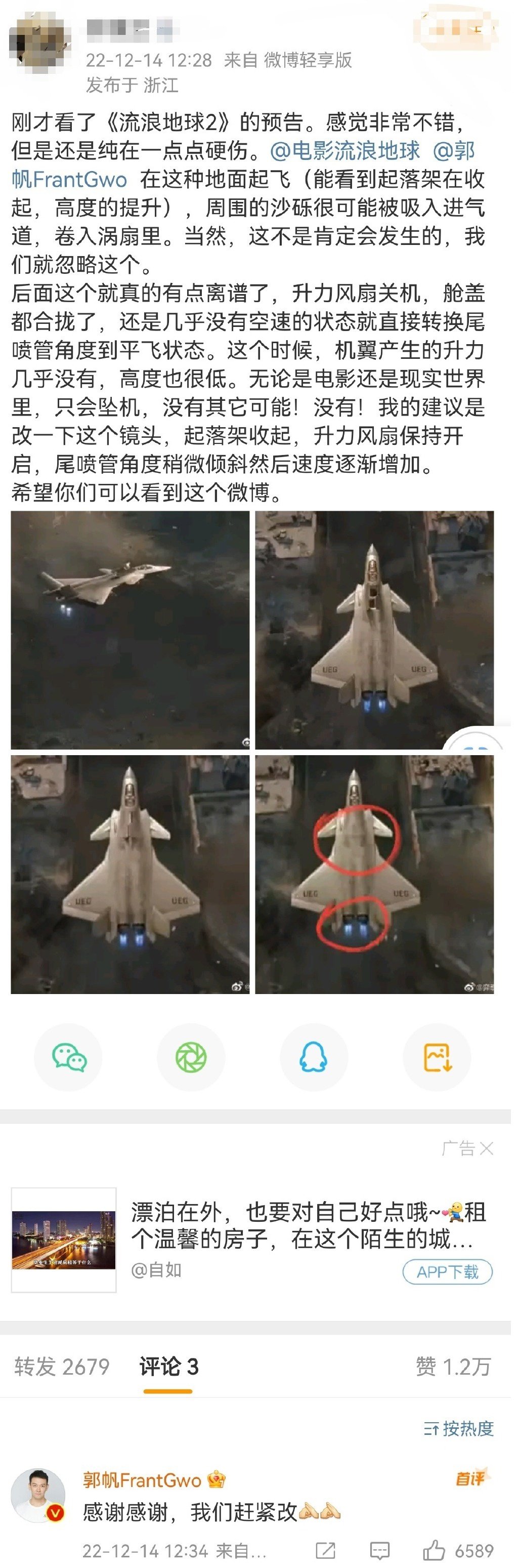 此外,网友反馈《流浪地球 2》“飞行器起飞”画面有问题,郭帆导演则在微博表示“感谢感谢,我们赶紧改”,最新预告中“战机”的镜头已经去掉了“空速管”。