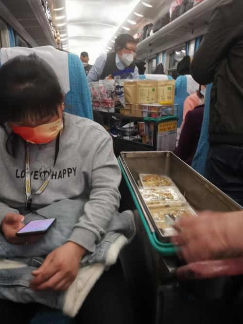 17点多,列车员又推着盒饭而来,卖的是土豆丝肉沫,20元一份,刘赛花自己带了一些小零食,自己一边吃一边将一粒糖炒栗子塞到了丈夫嘴里。