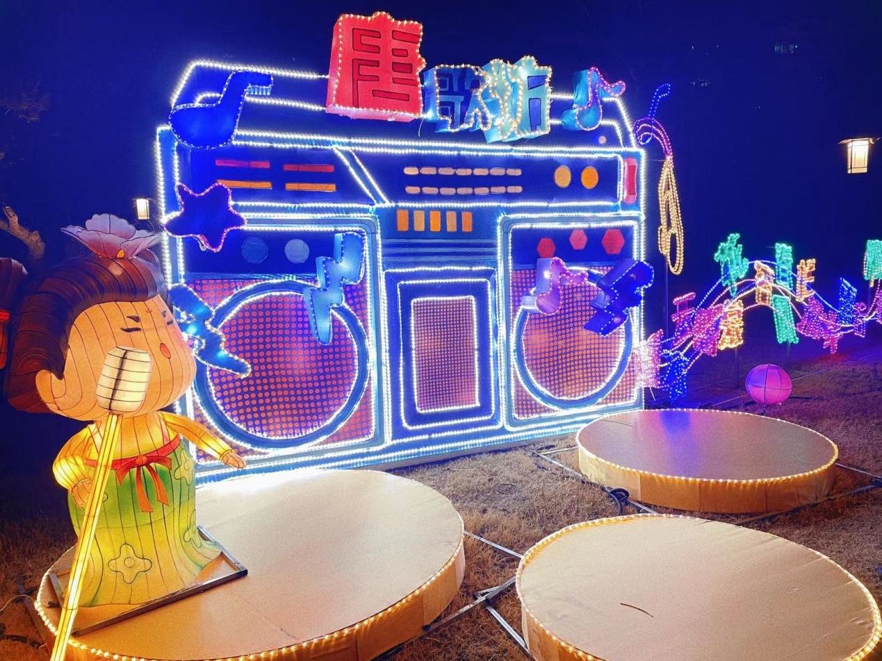 长30米的元宇宙“元宇宙穿梭机”灯组经过美术放样、丝架造型、分色裱糊、艺术美化处理等多个步骤,以科幻的灯光效果展现出不同于传统花灯的科技感。步入隧道,跟着可爱的唐妞一同观赏现代感的炫丽灯光,感受诗词歌赋的传统文化。