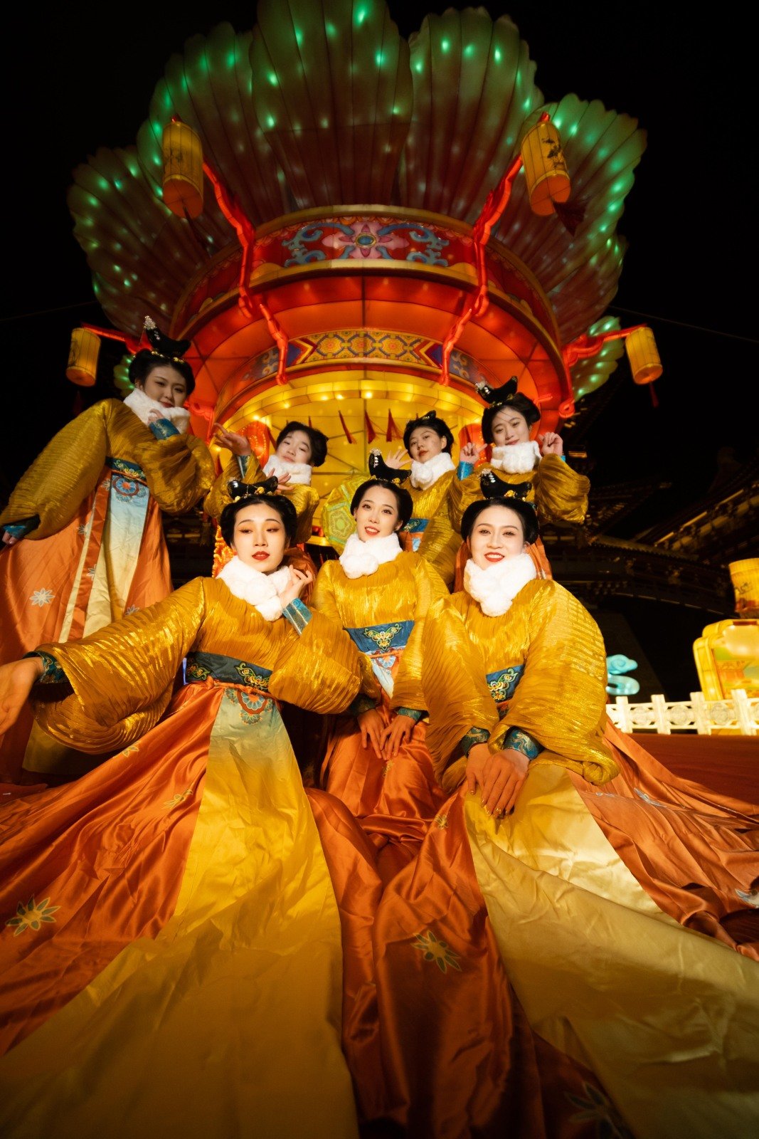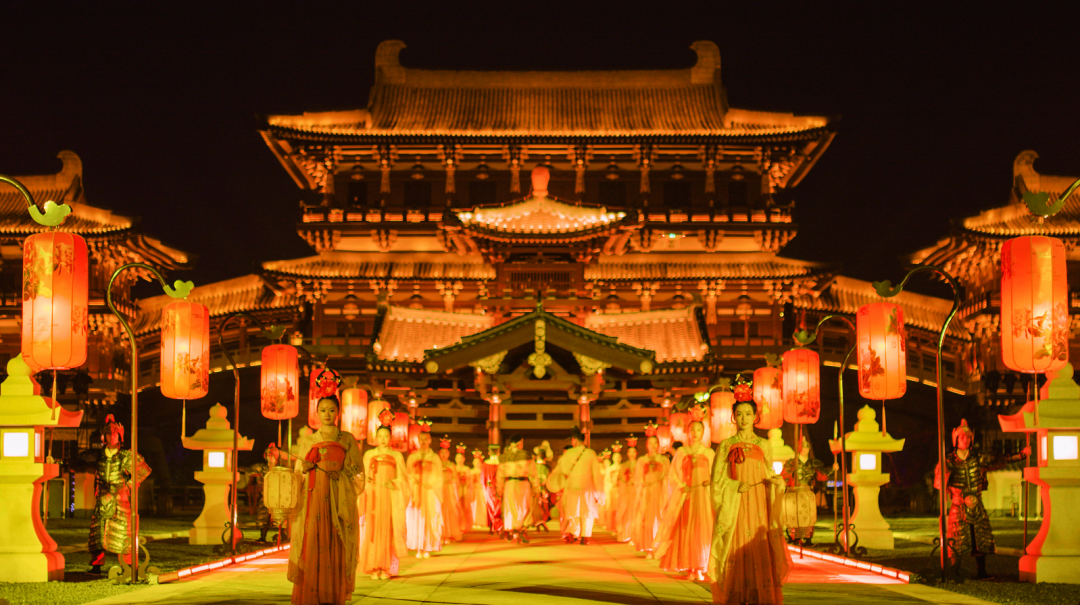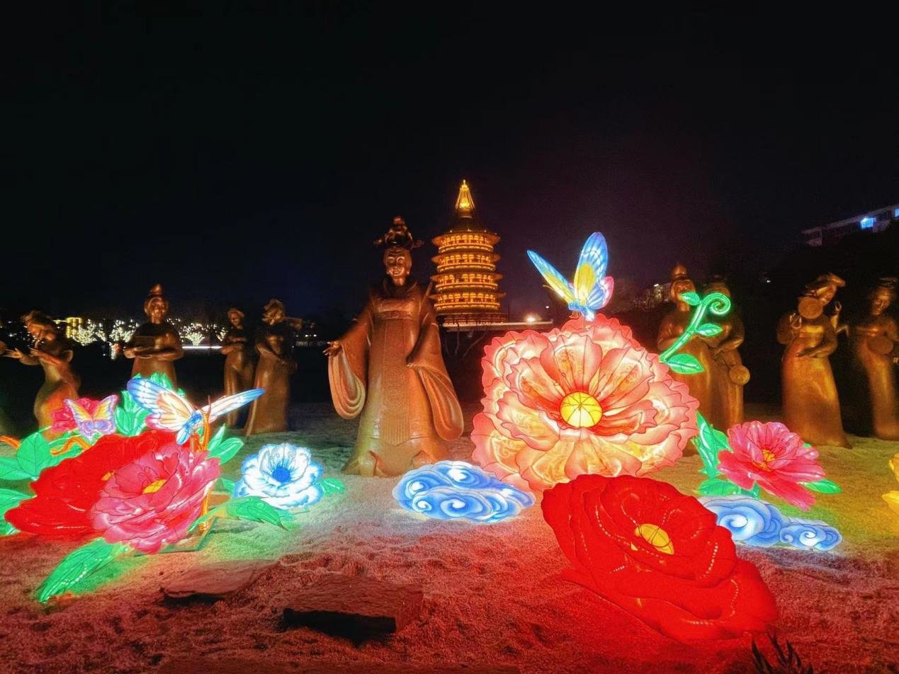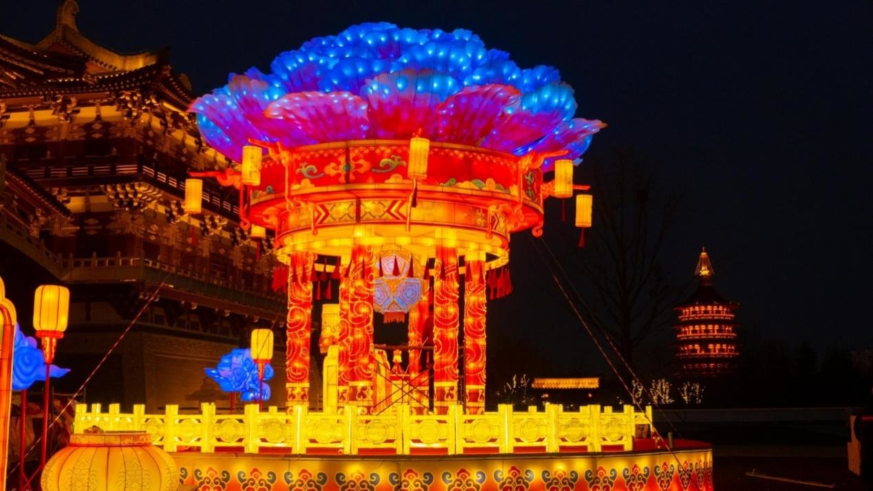 瑶光殿前高近8米的“花开盛世”灯组,特别结合洛阳牡丹元素,以立体的牡丹花造型为主体搭配唐风装饰,采用新型光源与灯光变换效果,形成视觉上的立体饱满感,更为惊喜的是它不仅仅是供人观看的灯,更是一个立体的演艺舞台,在观灯的同时为大家带来唐风古韵的精彩演出,给大家耳目一新的观感体验。
