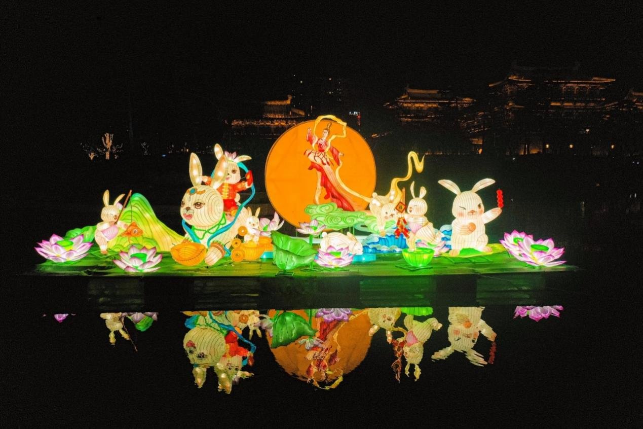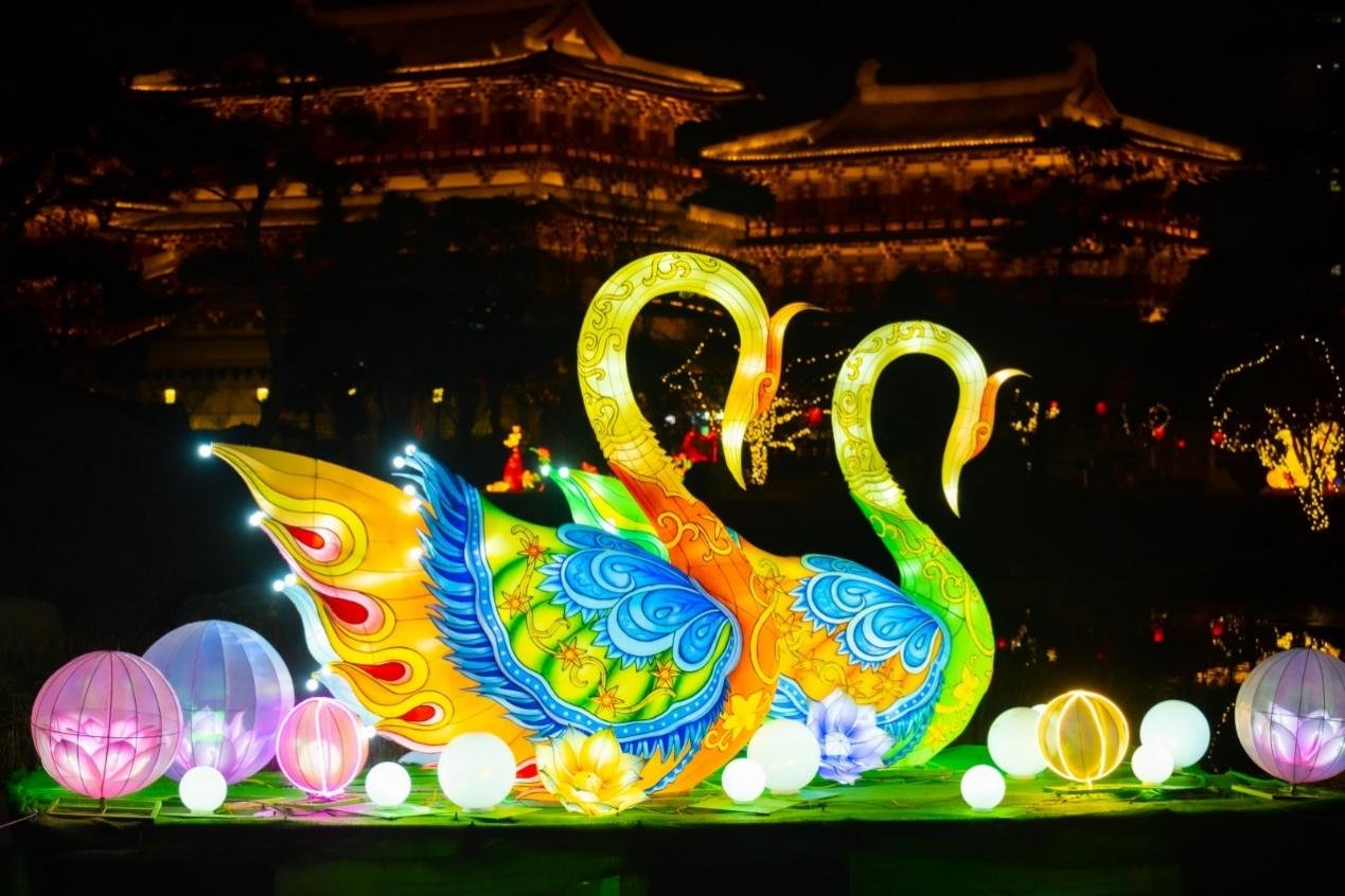 此次隋唐洛阳城九洲池皇家灯会中还特别设计有水上彩灯,如“天鹅之恋”“嫦娥奔月”等,在园内池面采用光影结合、花灯与建筑结合的方式为大家呈现出“一灯双景”的奇幻效果。