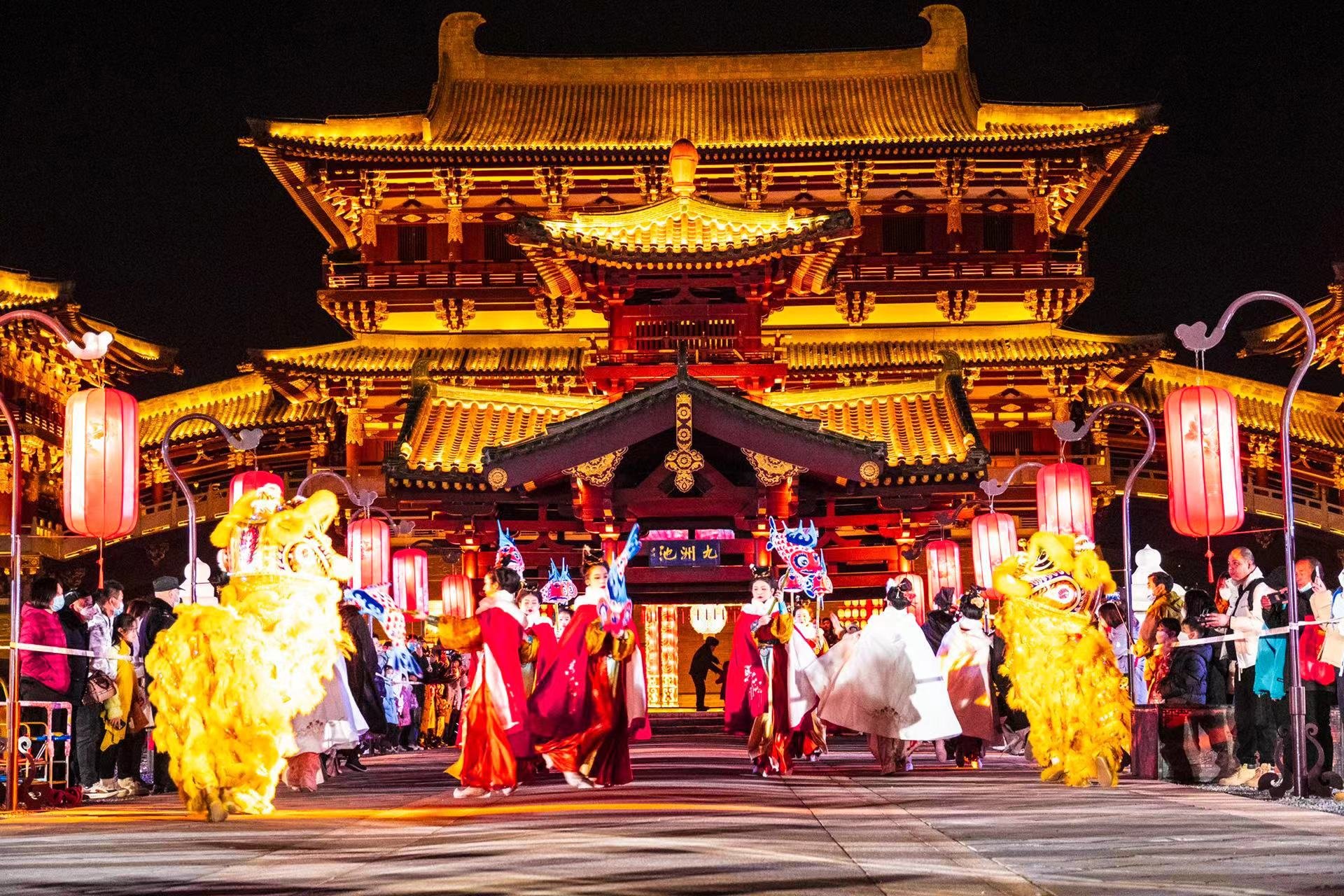 据了解,春节期间,九洲池除了璀璨夺目的花灯,每天还将上演精彩的九洲百戏,届时国潮舞狮、打铁花、鱼灯龙舞、民俗杂耍等精彩演出轮番上演,为广大市民游客奉上一场集文化、彩灯、传统表演于一体热闹非凡的新春视觉盛宴。