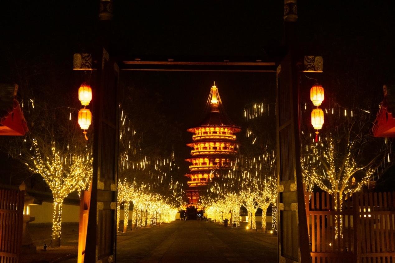 造型各异的一组组花灯被放置在园区内各个位置,与园内的假山池水、亭台楼阁相映成趣。此外,增加永巷、廊苑等园区内近千棵树木亮化与灯笼装饰,演艺广场草坪增设蒲公英地灯装饰,展现出“千灯点亮隋唐城,月影阑珊醉九洲”的幻美画面,同时也寄托着祈愿国泰民安、家和美满的新年祝福与憧憬。