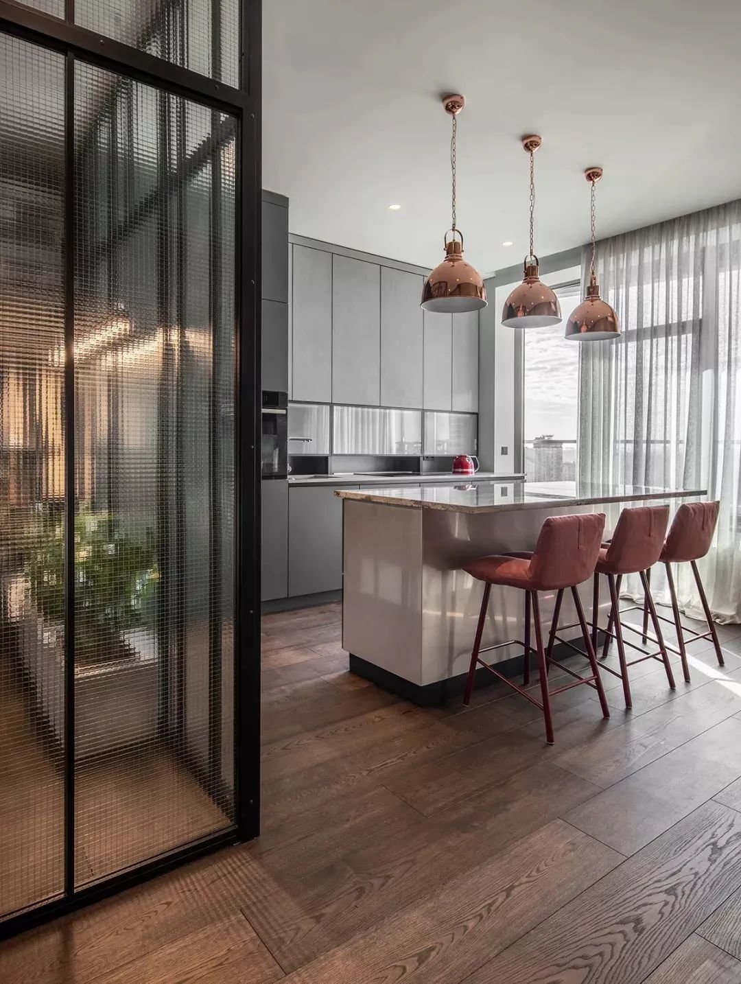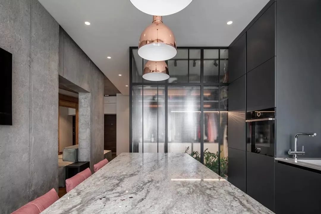 ▲左侧水泥灰的毛坯质感墙面,右侧是深灰色的定制橱柜、电器柜,石材台面的吧台布置,天花吊平顶装入筒灯,整个空间显得简洁实用而又低调高档。里面以长虹玻璃隔出一个衣帽间,为主人提供了一个储物强大的衣物收纳空间。