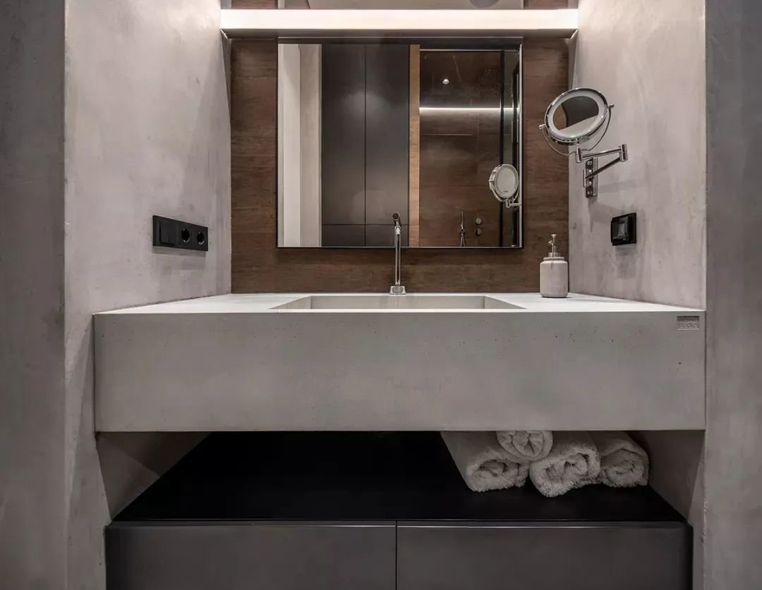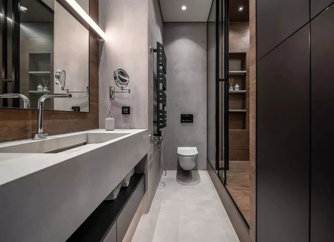 ▲卫生间以灰色的地面墙面搭配,装上一个岩板一体台盆,加入筒灯、筒灯等无主灯的照明,为主人布置了一个低调简雅的高级卫浴空间。
