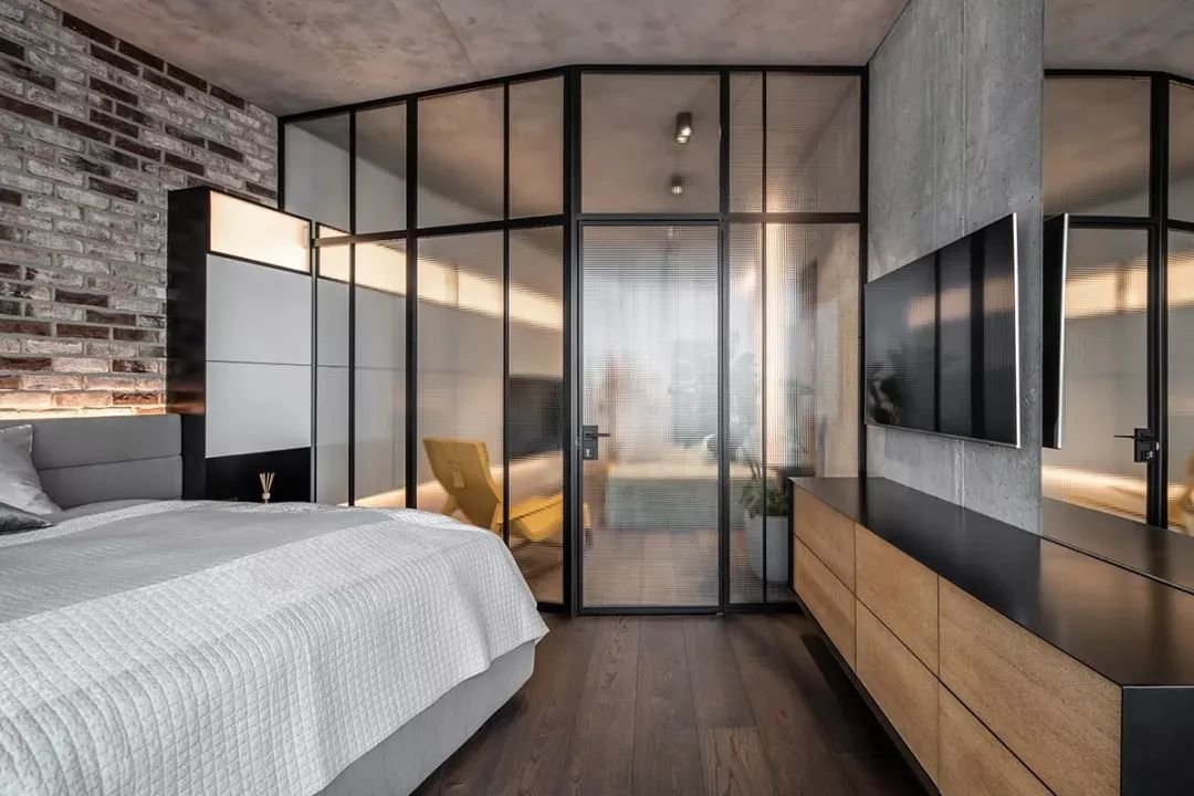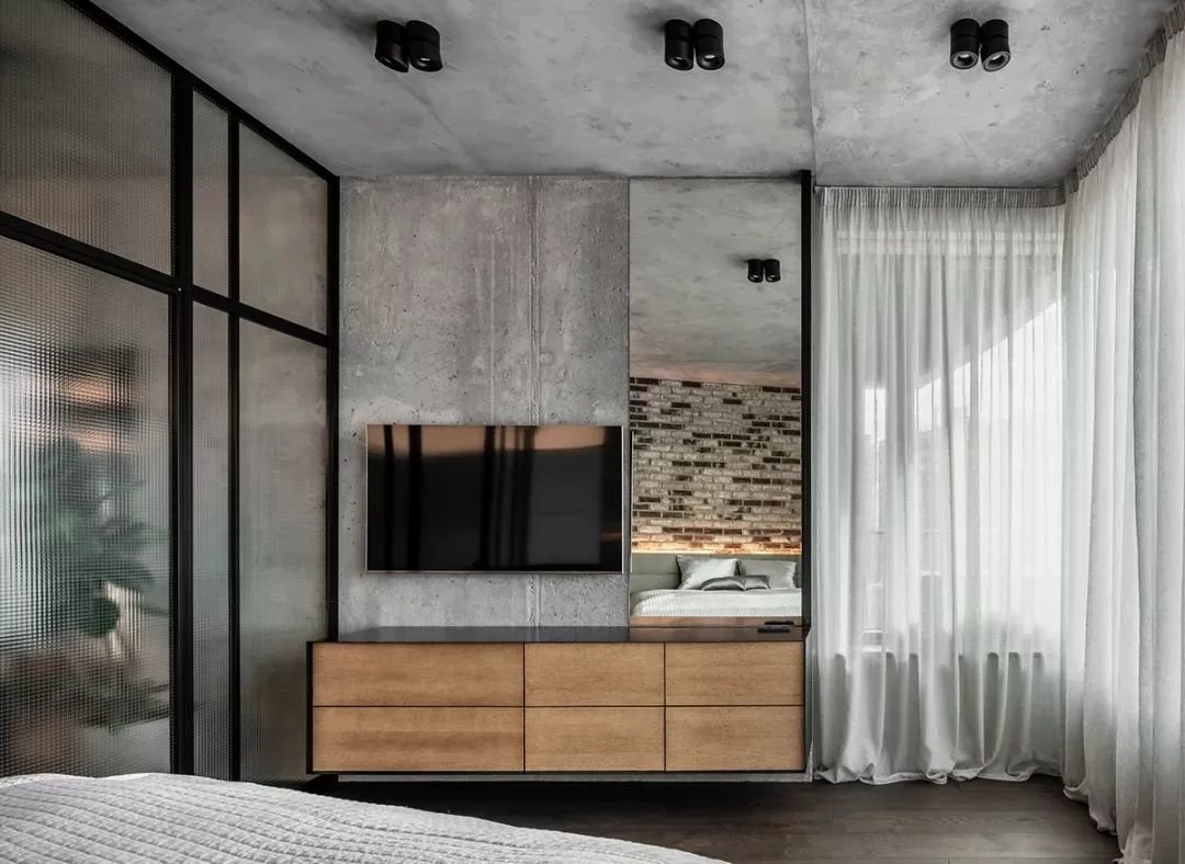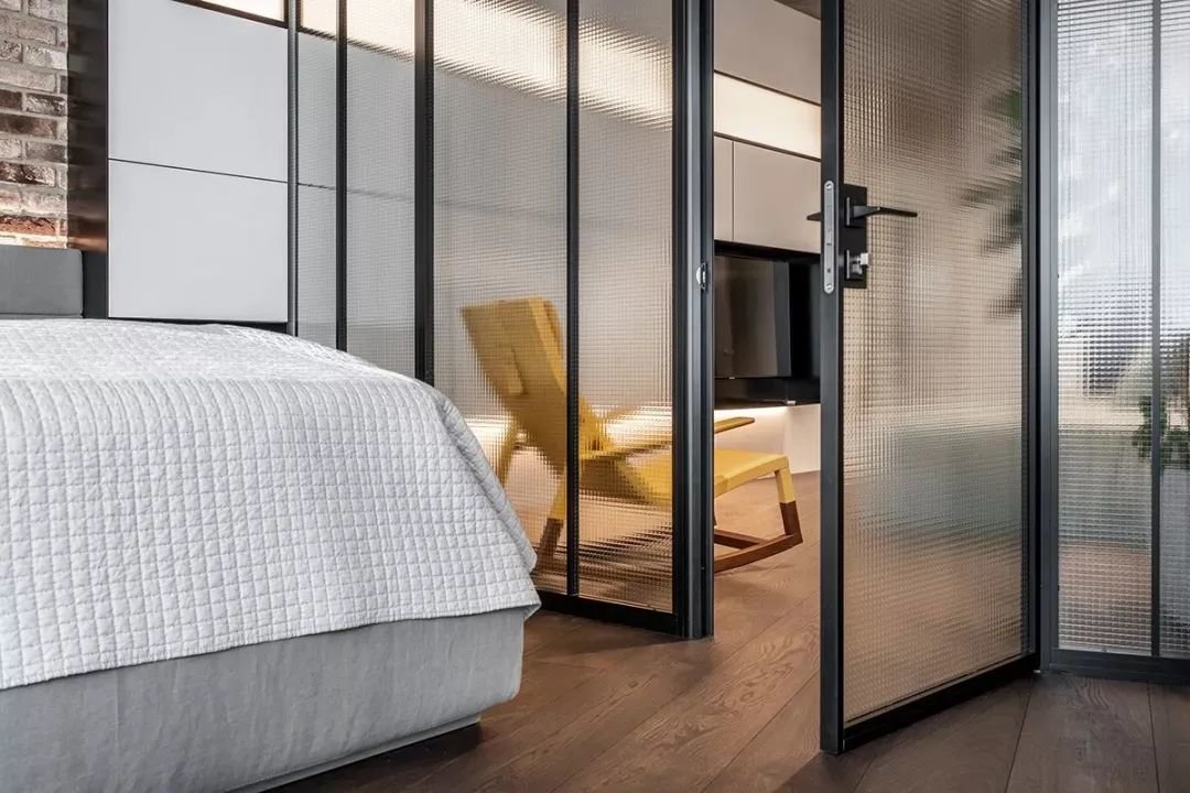 ▲卧室设在客厅里侧,以长虹玻璃作为空间隔墙,为没有窗户的客厅提供了明亮的自然采光,而长虹玻璃的质感也增添了空间的精致设计效果。灰白配的床铺,搭配床尾一个黑色+木色抽屉的斗柜,吊装一台电视机,整个卧室空间给人一种简约舒适的生活氛围。
