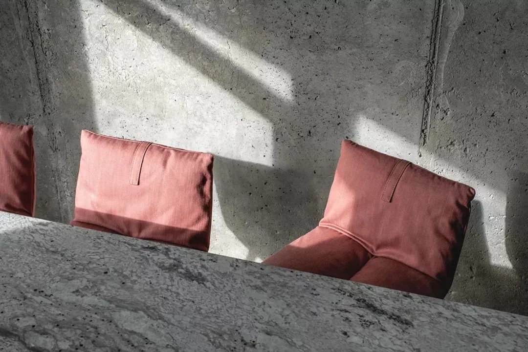 ▲暗红色坐垫靠背,水泥灰的墙面质感,在自然感的烘托下,呈现出一种朴素极简而又有低奢气息的效果。