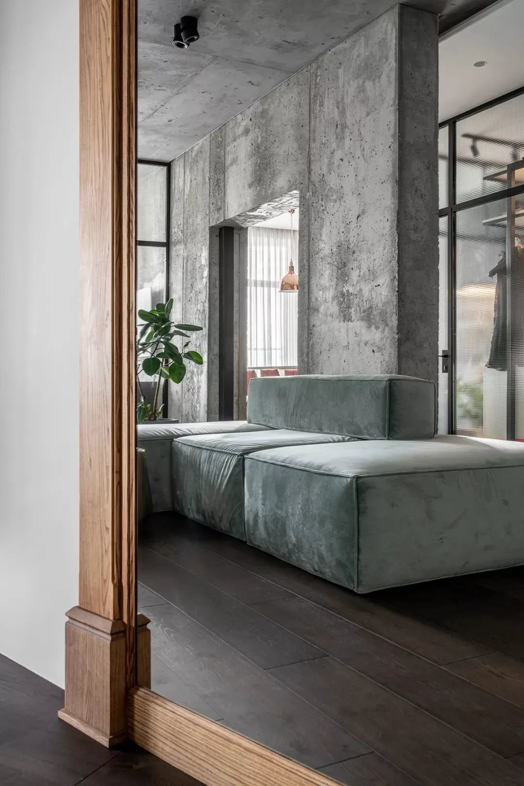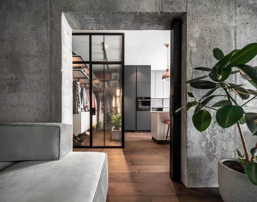 ▲毛坯质感的水泥灰门洞设在沙发墙上,与旁边的橡皮树绿植相呼应,后方衣帽间与餐厨区布置,整体空间显得充满清新自然的舒适感。