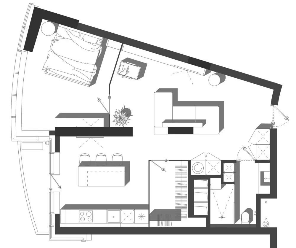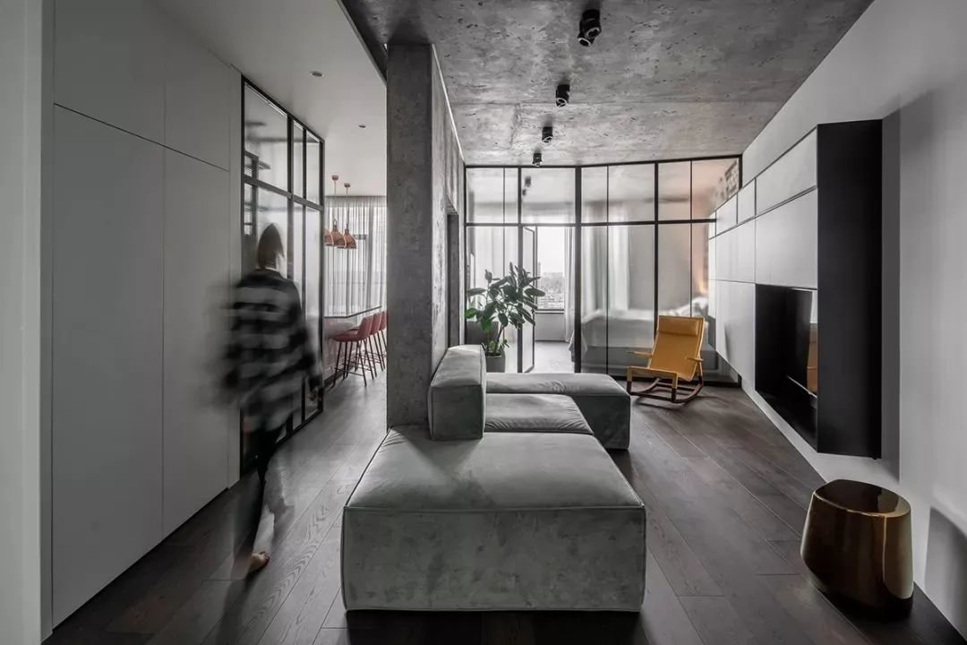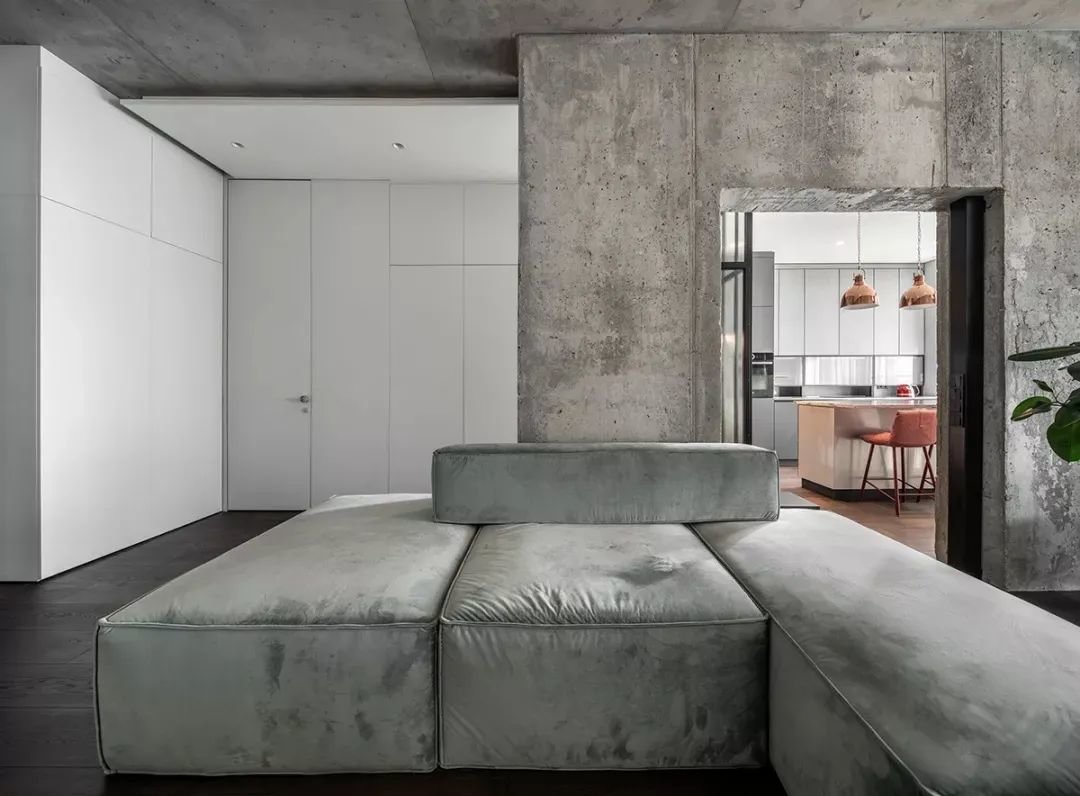 ▲公寓式的户型,客厅设在进门后的第一空间,沙发墙是一面承重墙,沙发围绕这面墙布置,灰色沙发+水泥灰天花+水泥灰沙发墙质感的搭配,呈现出一种大胆原始而高级的工业风设计。