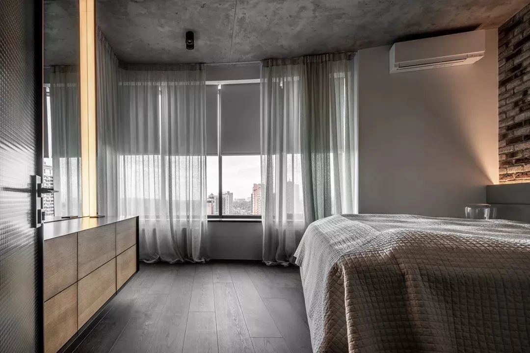 ▲不规则的卧室空间,在床头墙造型上加入暗藏灯带,加上水泥灰质感的天花,照射出一种温馨明亮的高级设计效果。