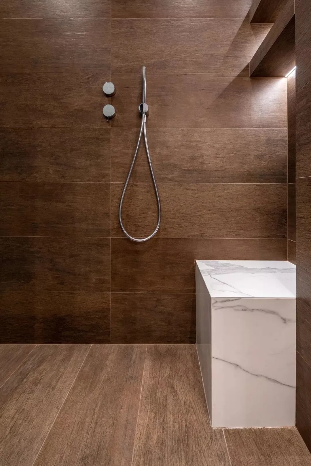 ▲淋浴房以木纹砖的地面墙面搭配,右侧加入一个现砌的小凳,方便坐着淋浴,上方壁龛藏入灯带,也让卫浴角落空间更为明亮舒适。