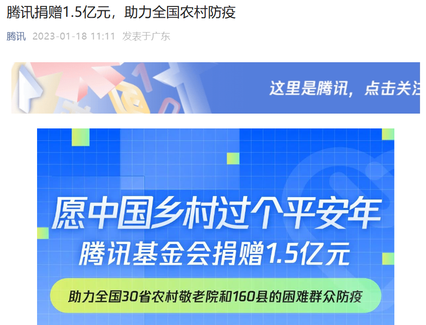 IT之家 1 月 18 日消息,腾讯今日宣布,腾讯公益慈善基金会捐赠总额 1.5 亿元人民币,主要用于助力全国 30 个省份 19778 家农村敬老院和 160 个国家乡村振兴重点帮扶县防疫。