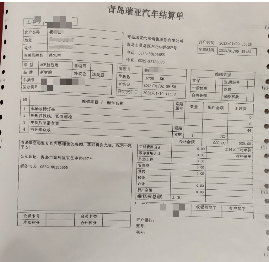 出现故障后,崔女士的车辆再次进入4S店检修。“这次4S店只是紧固变速箱螺栓和更换消音器,也没有说具体是什么故障。”崔女士表示。