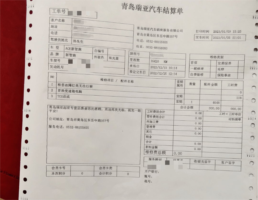 无奈之下,崔女士的车辆只能再次进入4S店检修。崔女士提供的维修记录显示,此次故障,4S店更换了变速箱的TCU(自动控制单元),崔女士也在12月31日取回车辆。