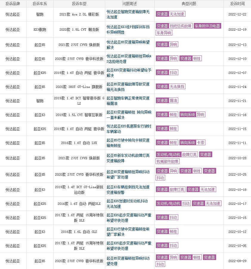 ▲起亚多个车型因变速箱故障被投诉(来源:车质网)