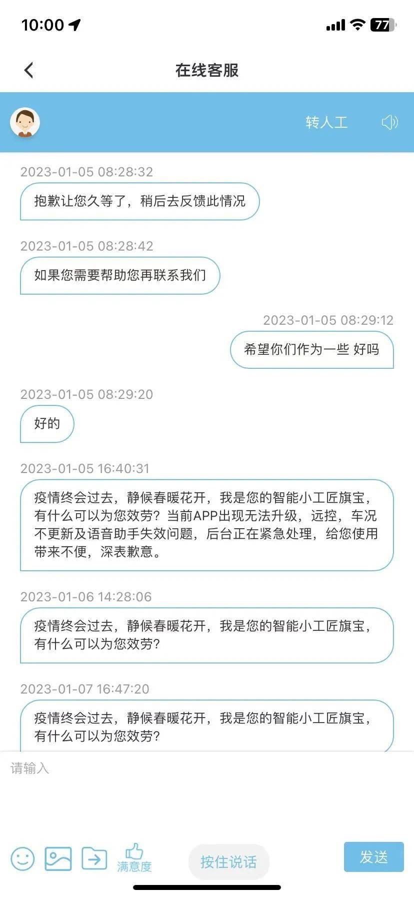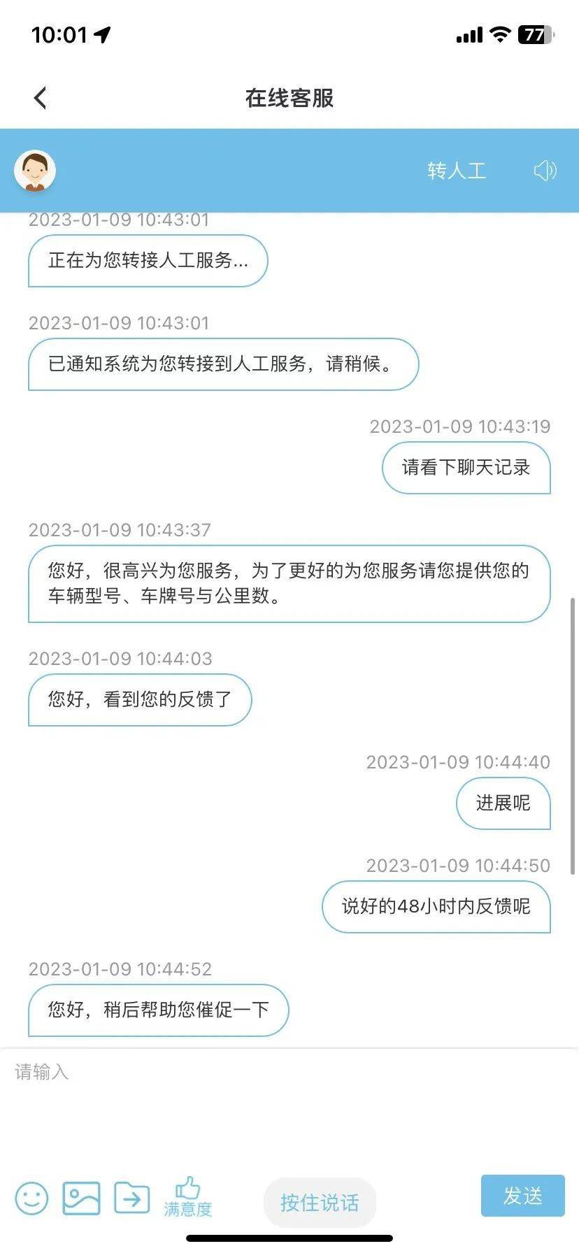 与上海森欣红旗4S店联系无果之后,胡先生多次通过客服电话和红旗官方APP向红旗方面进行投诉,不过问题同样未得到解决。“每次联系客服都说48小时内会回复反馈,不过基本没收到回复,也没有提供解决方案。”