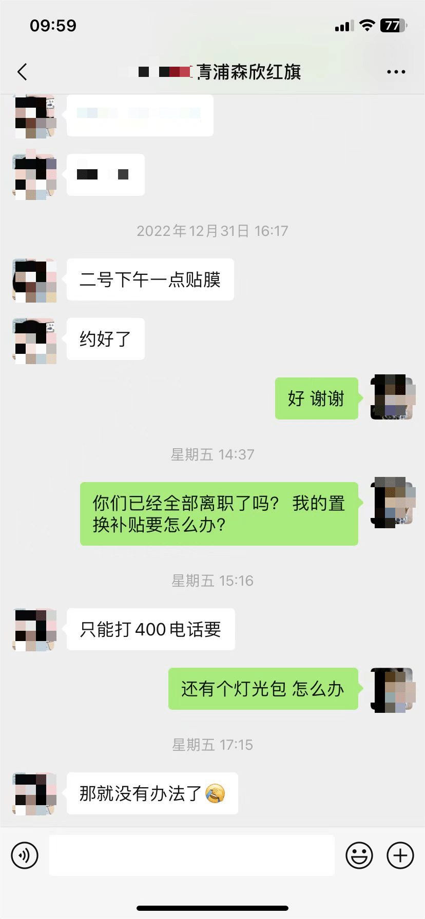 面对迟迟未到账的置换补贴,胡先生多次向上海森欣红旗4S店进行询问,不过始终未得到明确的答复。胡先生提供的聊天记录显示,涉事4S店销售人员表示“只能打400电话要”。“4S店让我打红旗的客服电话沟通,说置换补贴是红旗厂家提供的。”胡先生表示。