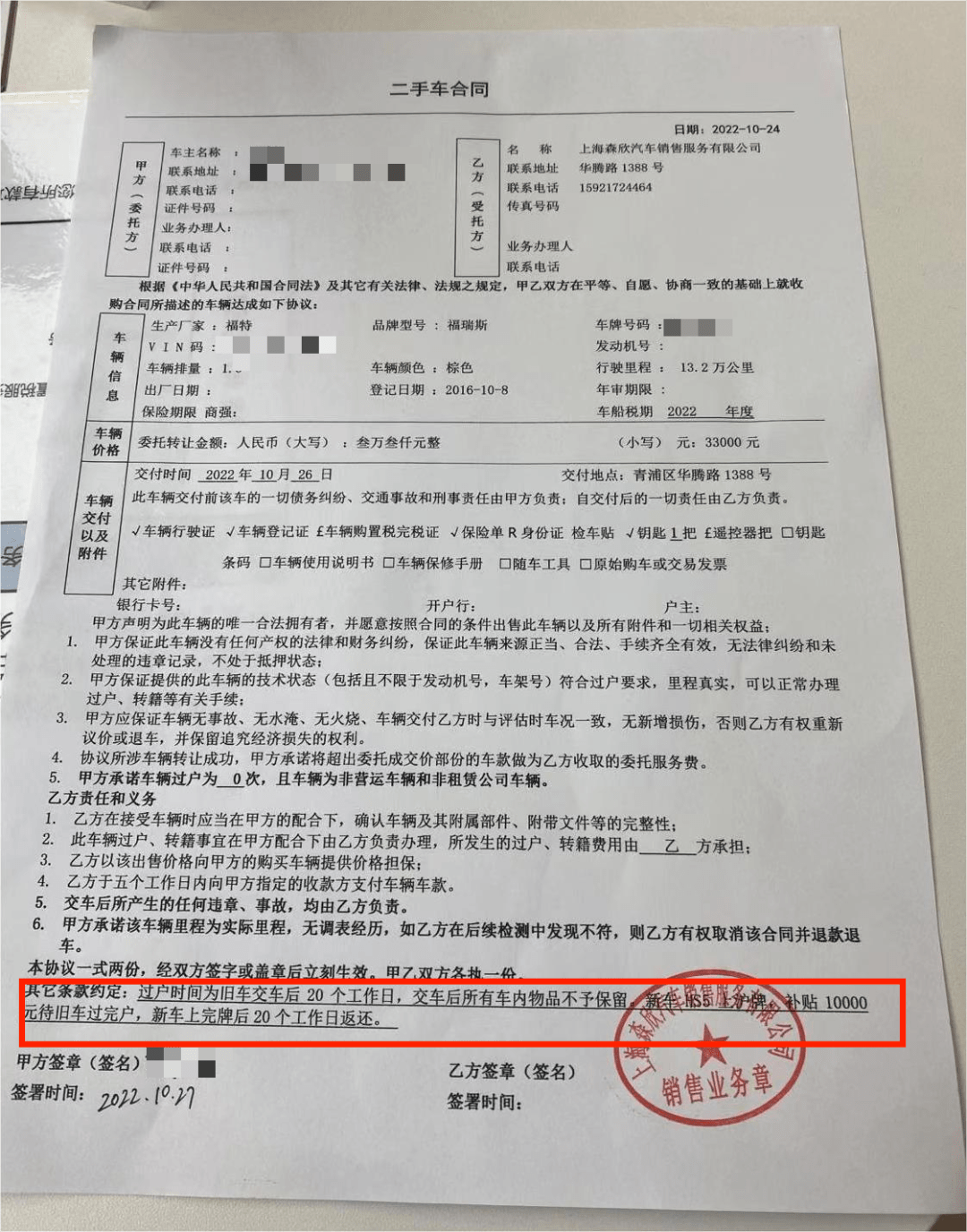 据胡先生介绍,他在购车时将自己原本使用的福特轿车委托上海森欣红旗4S店售出,并以此获得红旗方面提供的1万元置换补贴。10月27日,胡先生与上海森欣红旗4S店签署二手车买卖合同。