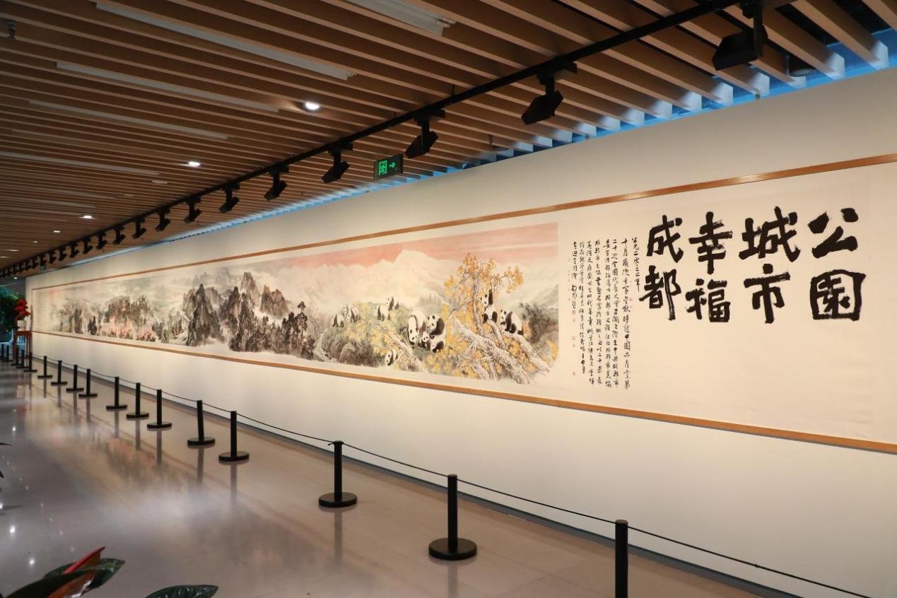 其中,“春风又绿锦江畔——成都博物馆癸卯新春雅集”活动于16日温暖上线。在馆内6层公共空间,一幅长达二十米的长卷《公园城市·幸福成都》铺陈展开。此卷由十二位名家联袂巨创,画中既有成都代表性元素如都江堰、芙蓉花、望江楼等,也有反映城市发展成就的地标性建筑如天府国际机场、双子塔、天府绿道等。当代都市题材与传统技法的巧妙融合,点染出新时代成都的自然和人文景观。
