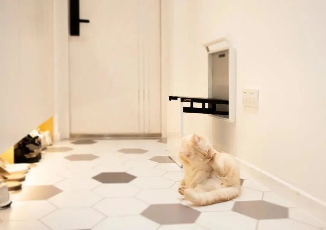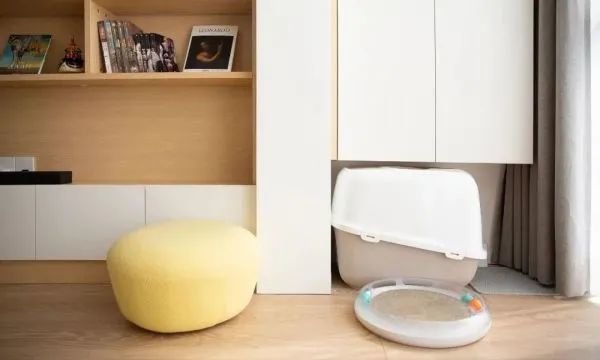 两侧阳台柜底部,特意给家里的猫咪留出了放猫砂盆和吃饭、喝水的地方。