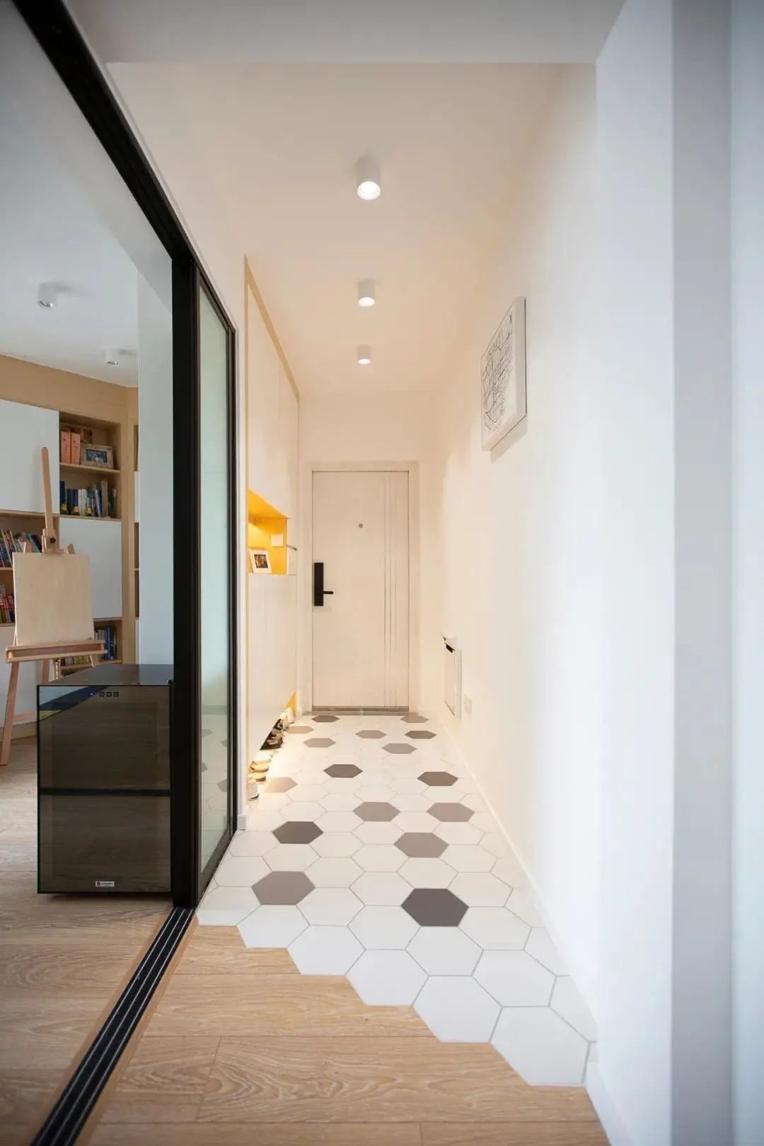 进门玄关地面采用六边形砖铺贴,黑白灰过渡和仿木纹砖拼接,自然划分不同功能区。