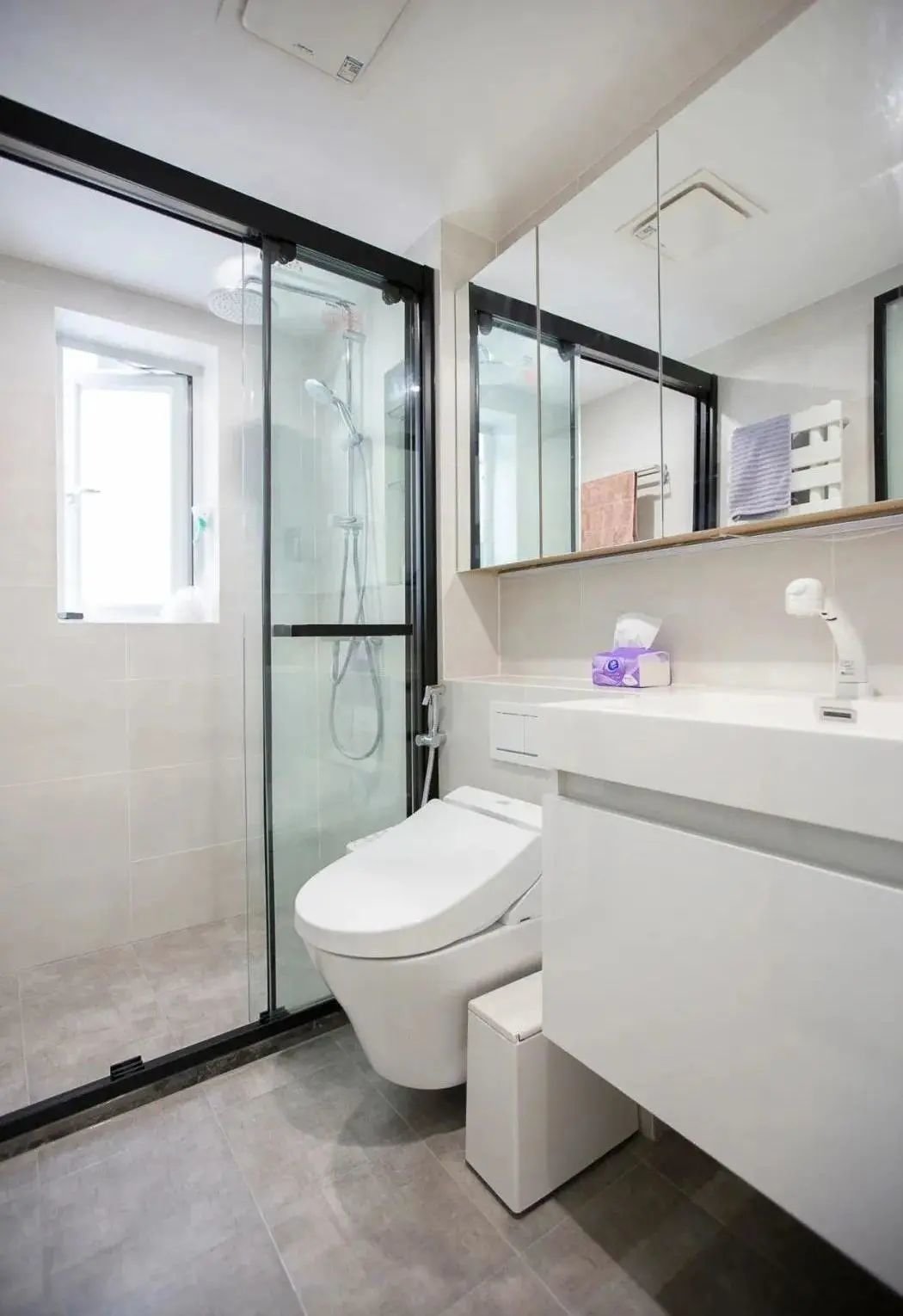 淋浴间采用玻璃隔断做了干湿分离,深灰色地砖耐脏好打理,做工精细简洁。可抽拉水龙头、智能马桶、清洁喷枪,营造便捷舒适的使用体验。