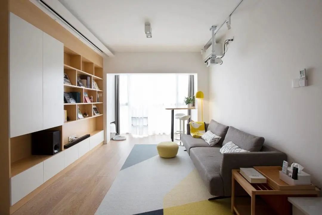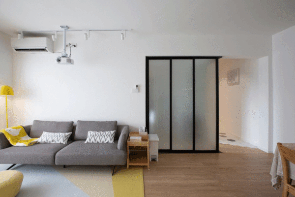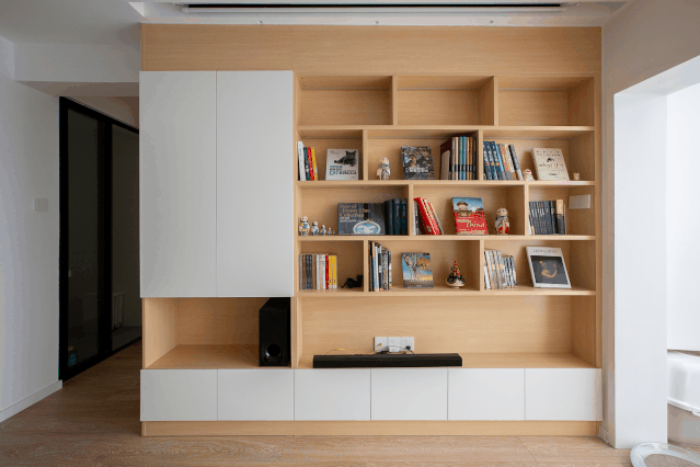 电视墙定制了一整面书架墙,用投影幕布代替电视机,既保证收纳又有观影功能,一举两得。