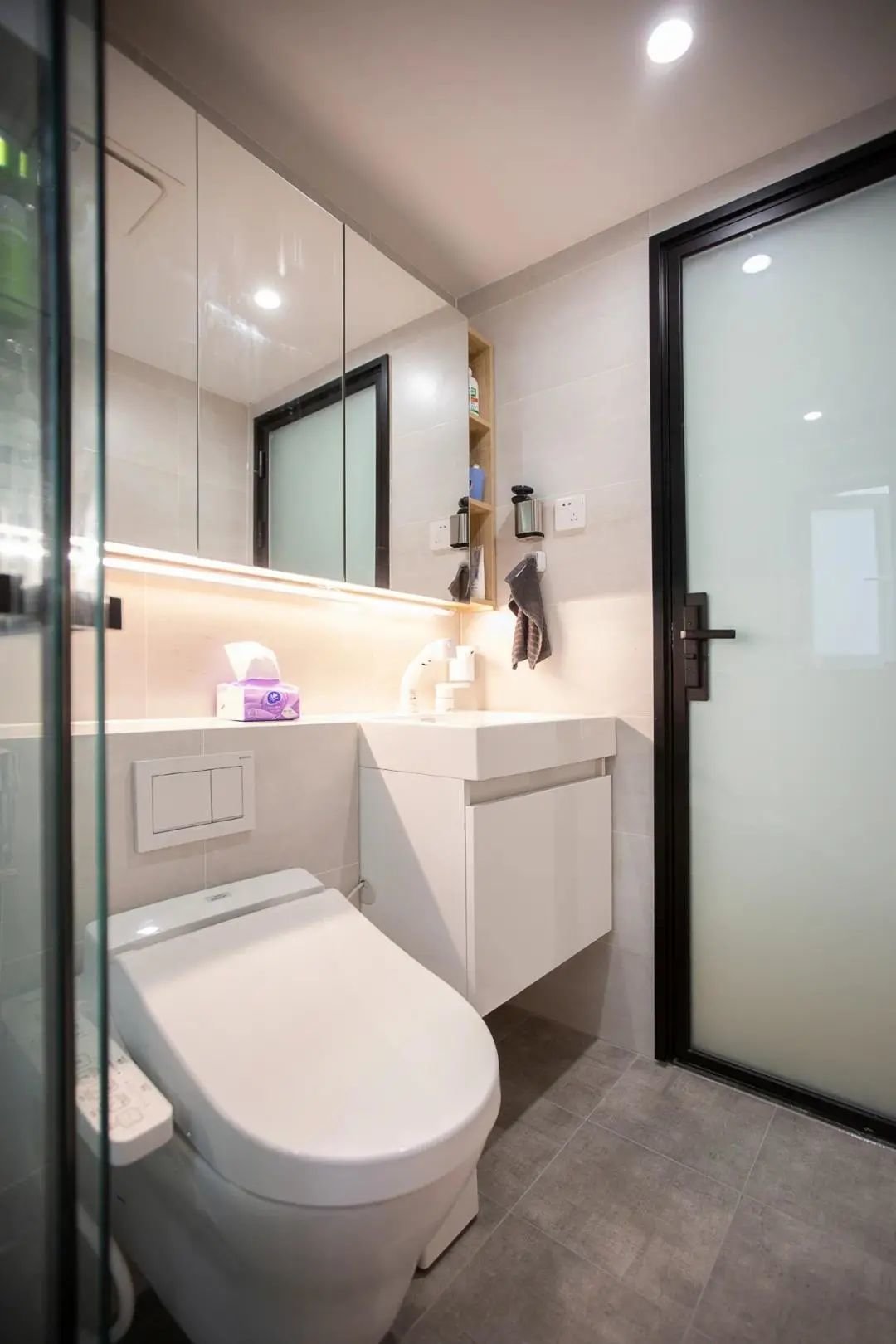 卫生间一整面镜柜增加收纳,底部安装灯条增加照明,侧面开架放常用的洗漱用品,避免经常开关柜门带来的不便。