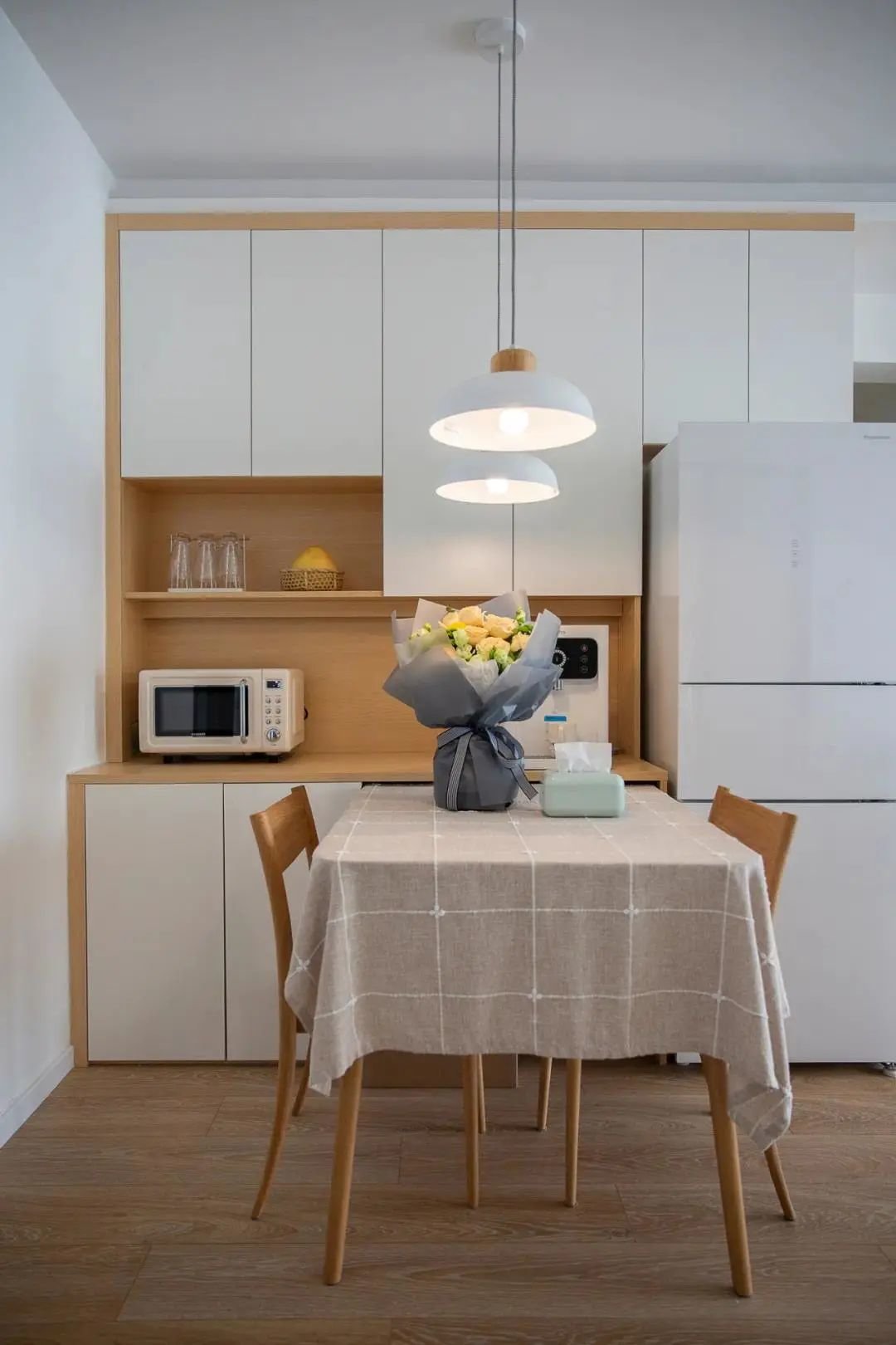 餐边柜有藏有露,拓宽的台面可以放微波炉、饮水机等小电器,作为厨房的补充收纳。
